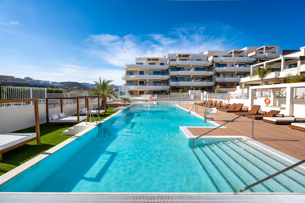 Enjoy panoramic views towards the sea & a beautiful terrace at this new, luxury apartment, in an amazing location - just a few minutes walk to the beach, shops, bars & restaurants! There's a beautiful, large pool with premium bali bed sunloungers. The apartment consists of two spacious bedrooms, two bathrooms, a large living room with modern open plan kitchen. Everything has been thoughtfully prepared and all furnishings are of very high quality. Free parking.
