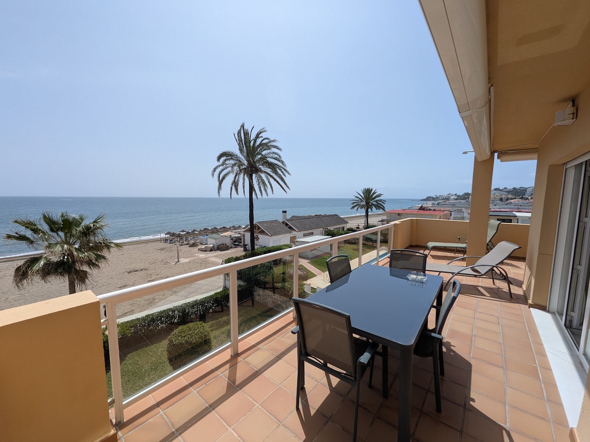 Cozy, bright, entirely renovated quality flat on the front line with sea views from the sunny and large balcony, both rooms and the bathroom. Features his and her shower, full kitchen, 2 tennis courts, 2 swimming pools (1 for children) large gardens, private beach area, free beach beds and private parking. We have a sandy beach with Blue Flag status and direct access to the sea boardwalk. Near Marbella and La Cala with 75+ restaurants and many shops walking distance. Strict cleaning protocols.
