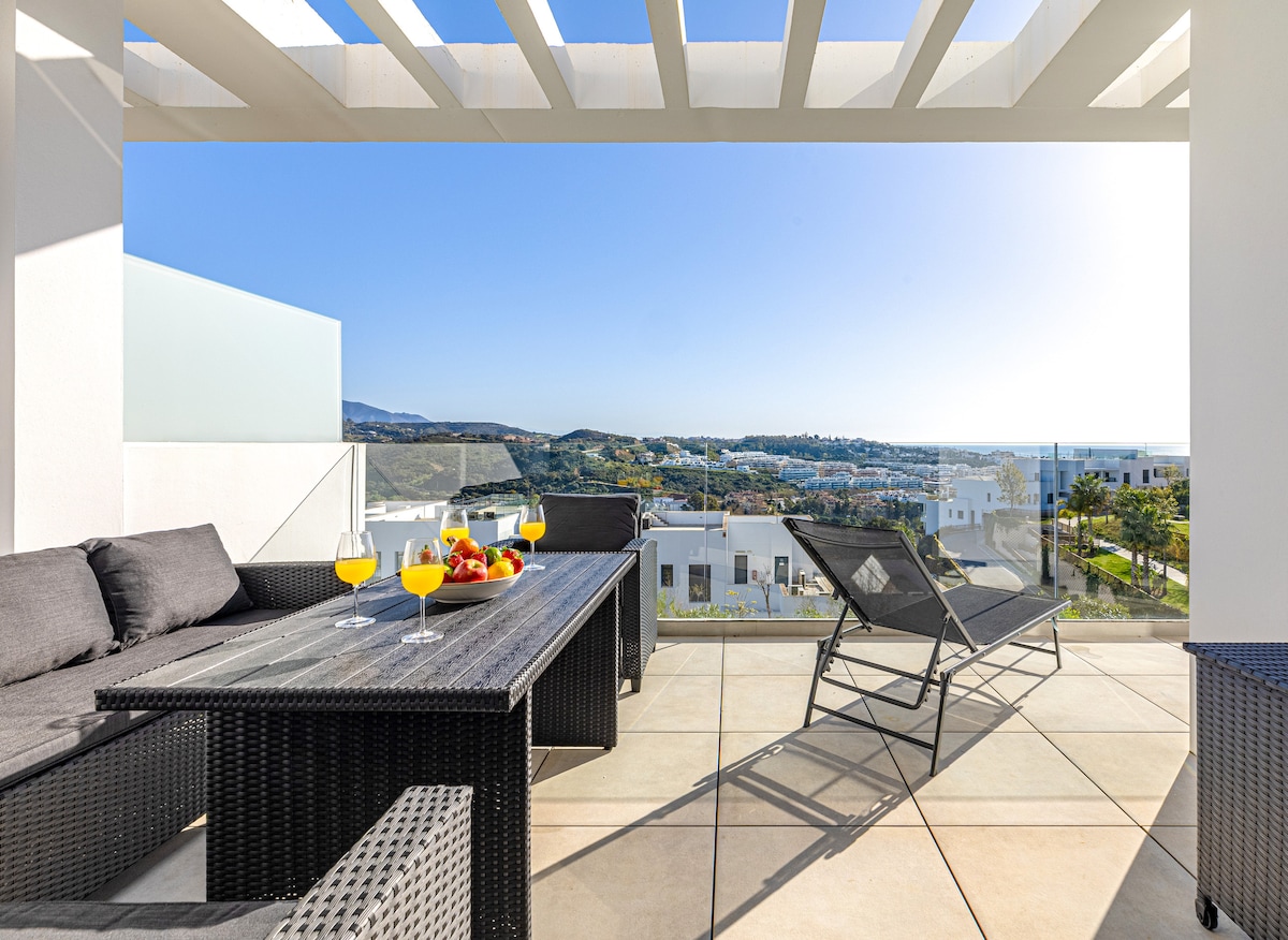 阳光顶层公寓,带全景、游泳池和高尔夫球场
