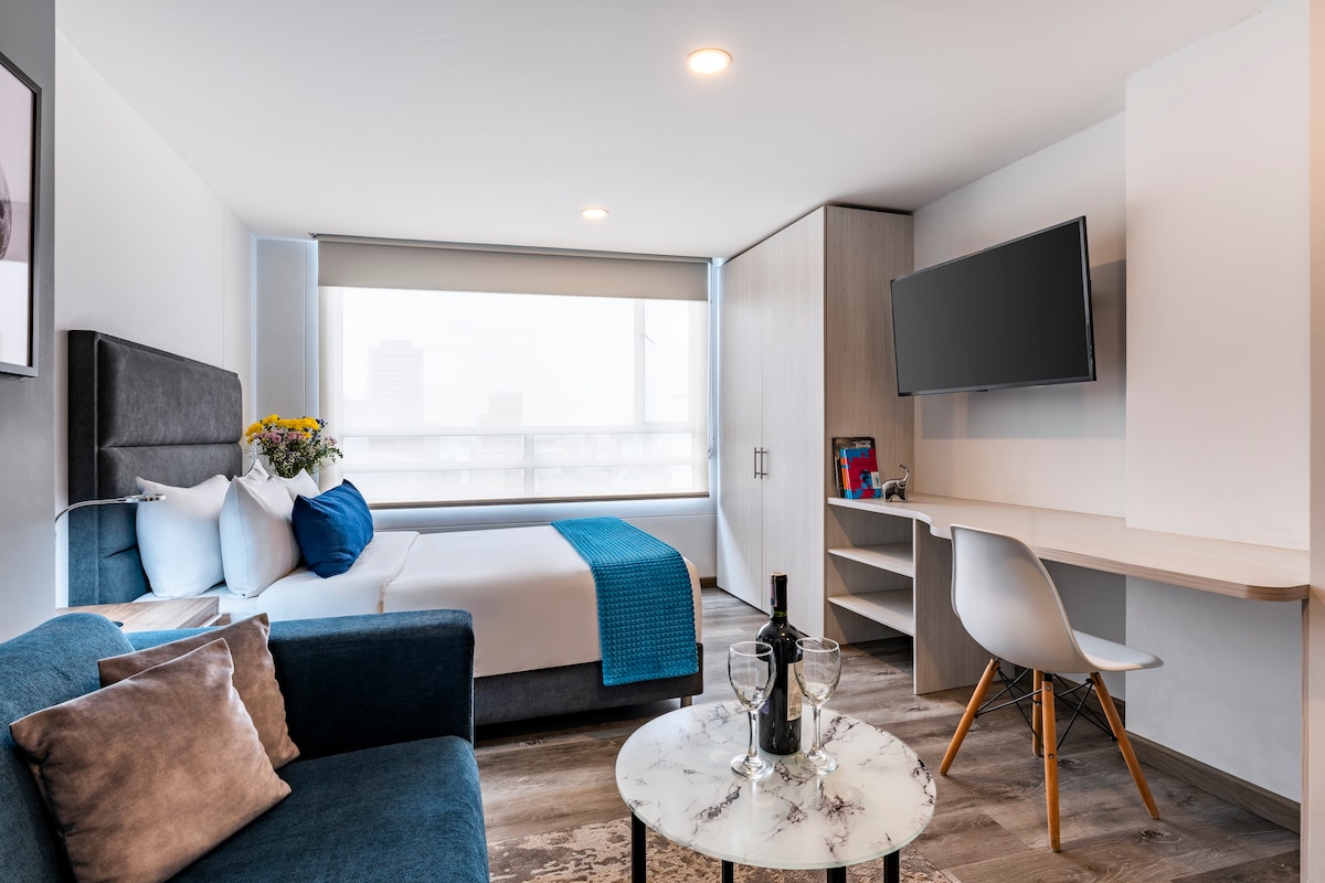 Acogedor apartamento, el cual cuenta con cama doble, televisor, escritorio, sofá, armario, baño privado y cocina con todos los implementos y electrodomesticos necesarios para uso del huésped, todo nuevo. El conjunto esta ubicado en una zona muy central, cerca del centro historico e internacional, donde se encuentran los mayores atractivos de Bogotá. Con vias de facil acceso y sistemas de trasporte publico que conectan el centro con el aeropuerto y la terminal de transporte.
