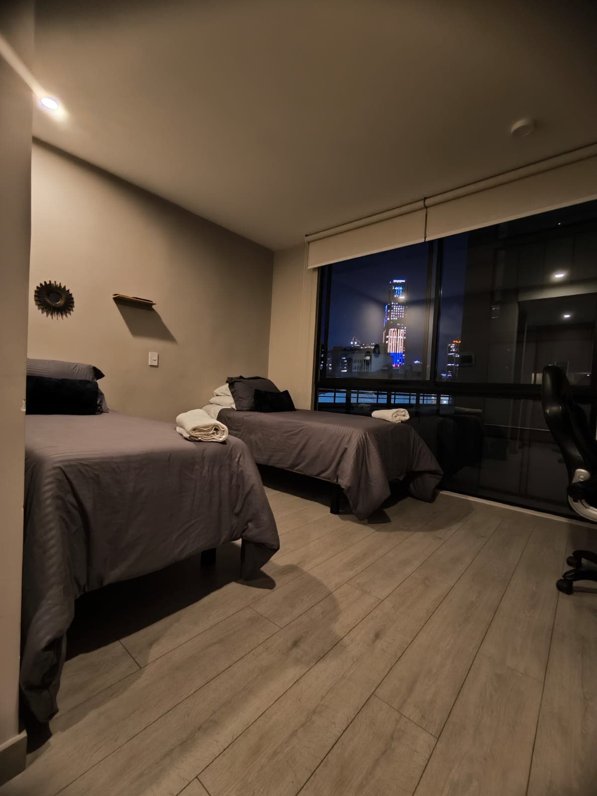 Hermoso penthouse duplex en el centro de Bogotá con la mejor vista a la ciudad, zona social del edificio con piscina climatizada, jacuzzi, sauna, gym, terraza BBQ, y coworking. Cuenta con todas las comodidades para hacer de tu estadía en la ciudad un tiempo muy agradable. La zona cuenta con supermercados, farmacias, restaurantes, bares, discotecas, La macarena, El museo Nacional y El Planetario de Bogotá. 130 m2. Espacio hasta 6 huéspedes, 6to en sofacama.