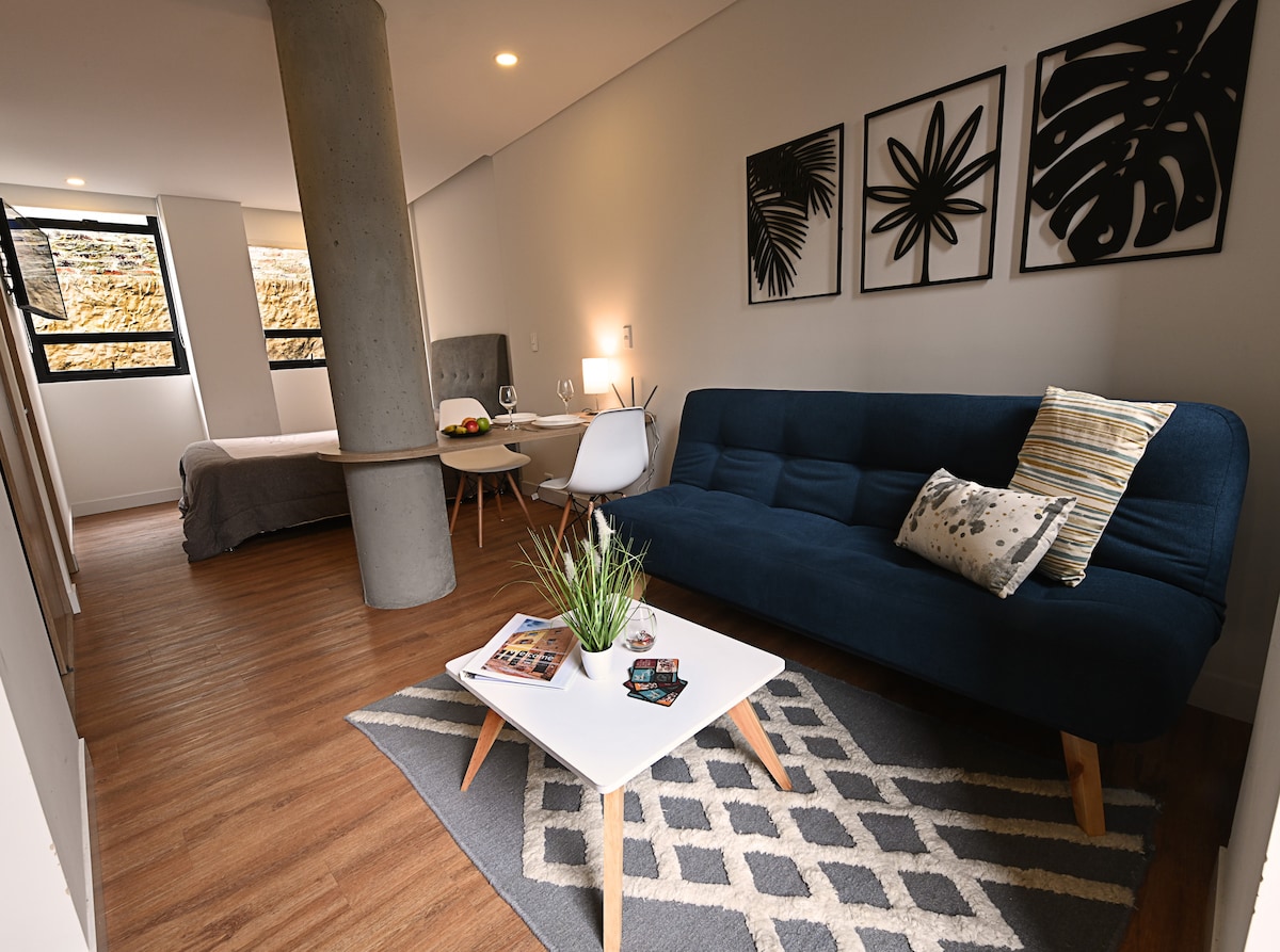 Enjoy a unique stay in this beautiful and cozy high-rise studio, perfectly located in La Candelaria. Ideal for couples or solo travelers. Just steps from Bogotá’s main tourist attractions such as Monserrate, the Gold Museum, Quinta de Bolívar Museum, and Chorro de Quevedo. This space places you in the cultural and historical heart of Bogotá. Explore colonial streets, taste local cuisine, and immerse yourself in art and history—all without needing transportation.