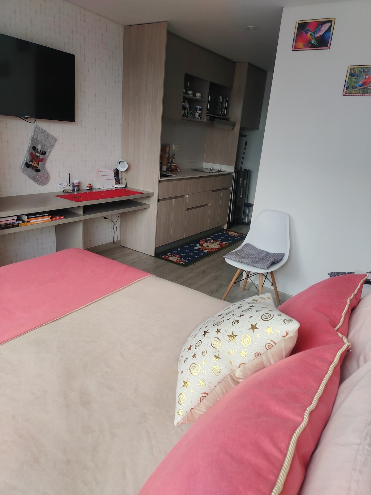 Apartamento tipo loft, remodelado, gran iluminación, cuenta con 1 cama doble, Televisor smart tv, escritorio, internet ilimitado Wi-Fi, cocina equipada con menaje completo, baño privado con agua caliente, zona de lavandería y secadora en edificio gratis, escaleras, ubicado en una zona bastante comercial cerca de supermercados, zona bancaria, universidades y restaurantes, cerca Transmilenio. no tiene parqueadero, Parqueaderos a pocas cuadras. Incluir el numero de huéspedes EN RESERVA.