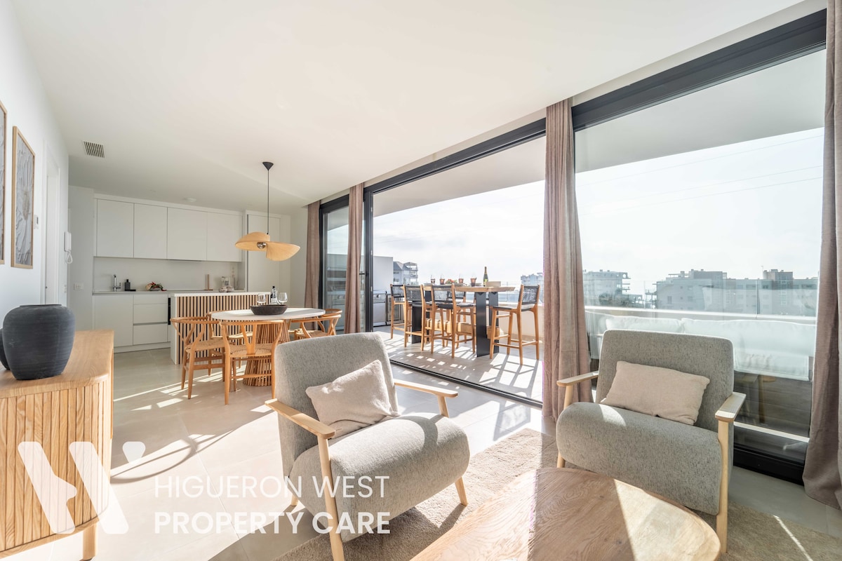 Experience luxury living in this bright apartment located in the exclusive area of Fuengirola! Built in 2022, this 123 m² apartment features: 3 spacious bedrooms, 2 modern bathrooms, bright and open living/dining room with floor-to-ceiling glass doors that provide direct access to the big 45 m2 terrace with a quality lounge area, dining table, and sunbeds, fully equipped and open-plan kitchen. The apartment is tastefully furnished with modern and comfortable Scandinavian-style furniture.