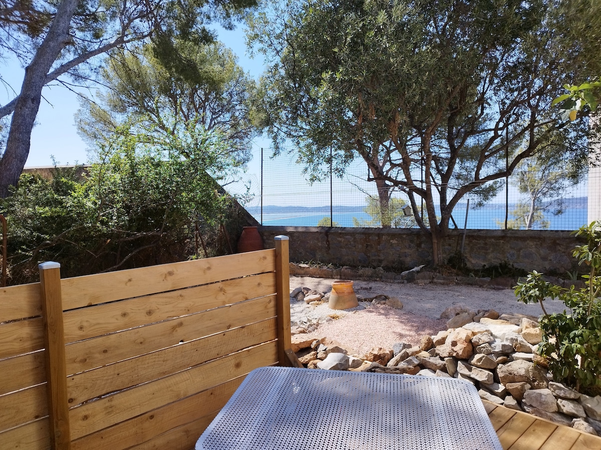Magnifique appartement T2, climatisé, de 45m², en rez-de-jardin, situé à 500m à pied des plages de la Badine et de l'Almanarre. Cet appartement bénéficie d'une terrasse privative et d'une entrée piétonne indépendante via un petit chemin. Il a été aménagé pour accueillir 2 personnes. Il se compose d'une grande pièce de vie avec cuisine et salon donnant sur la terrasse et équipé d'un canapé, d'une chambre avec lit queen size, d'une salle d'eau avec wc.