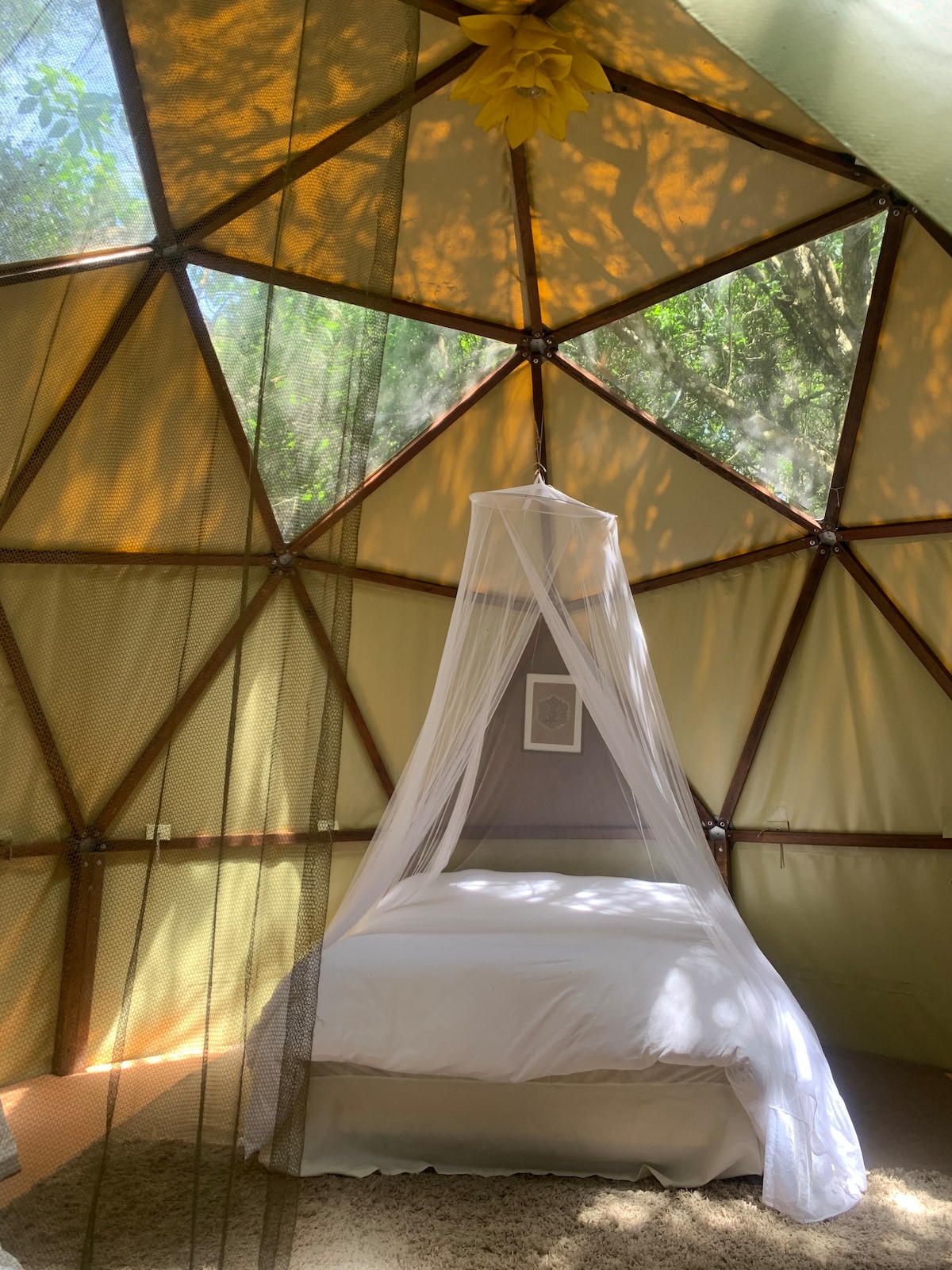 Relájate con toda la familia en este alojamiento donde la tranquilidad se respira. Un lugar rodeado de bosque y fauna nativa. En la naturaleza y cerca de la ciudad. El.domo tiene una cam matrimonial y otra simple. Cuenta con un baño exterior privado. Hay una pequeña cocinita solo para hervir agua y o calentar algo simple. Te ofrecemos alimentación casera vegetariana o vegana, clases de yoga y meditación, masajes relajantes y conciertos de sonidos. si te interesa podemos enviarte los valores .
