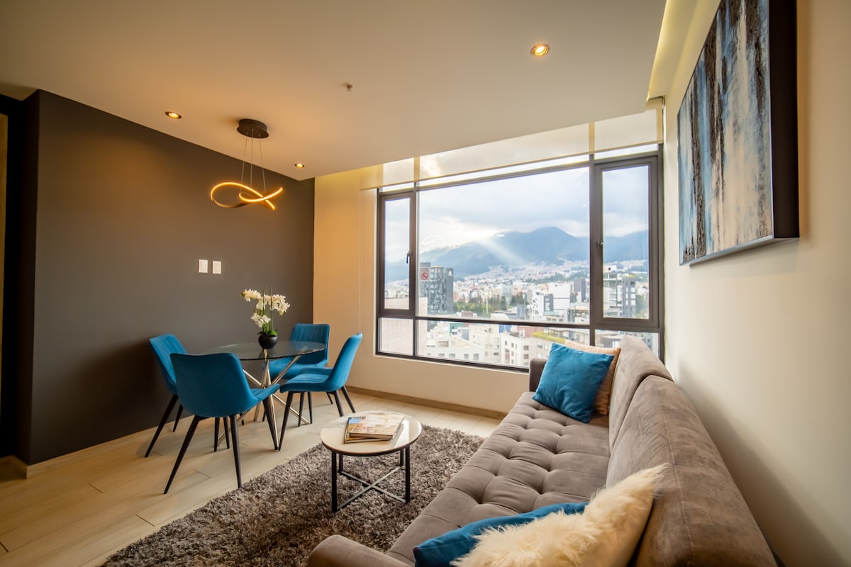 -Suite nueva de lujo, amplia, cómoda en Edificio Eco-eficiente -Piscina , sauna , turco, hidromasaje , Gym, App para utilizar áreas (sujeto a reserva según disponibilidad del edificio) -Ubicado en la mejor zona de Quito, zona segura de fácil acceso con vehículo y transporte público -Walking Score 87, cerca de todo caminado , mas de 200 negocios (restaurantes de lujo, centros comerciales, farmacias, sitios turísticos y parques)