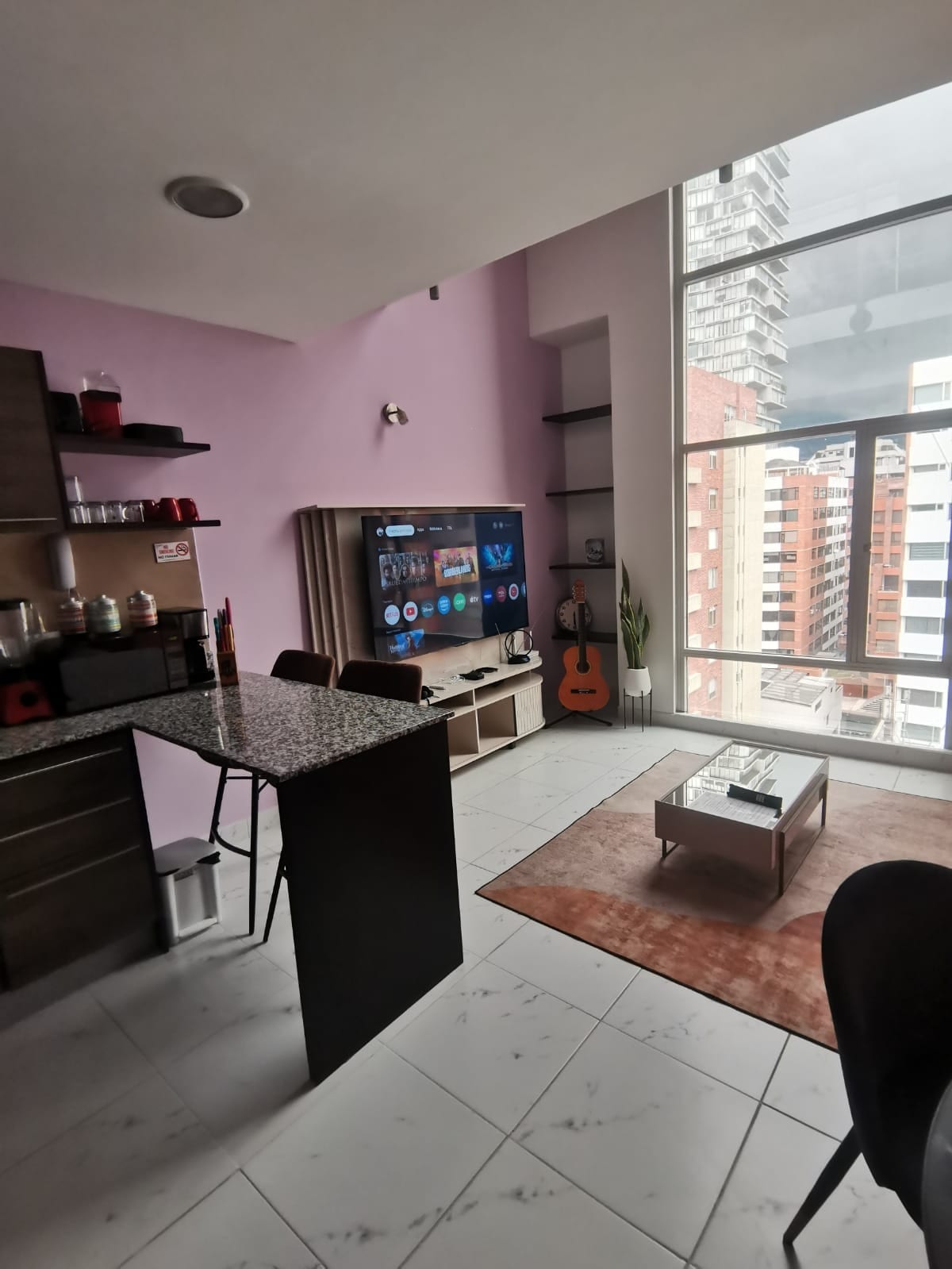 Moderno loft piso 21, edificio nuevo con generador de luz autónomo, ideal para viaje de negocios o para una ocasión especial, vista única de la ciudad. Ubicación privilegiada en el centro norte de Quito junto al parque La Carolina, además a tan solo unos pasos encontrarás centros comerciales e instituciones financieras. El servicio incluye parqueadero, wifi, cine en casa, tina de baño, agua caliente, lavadora/secadora comunal, elementos de higiene, gimnasio y piscina.