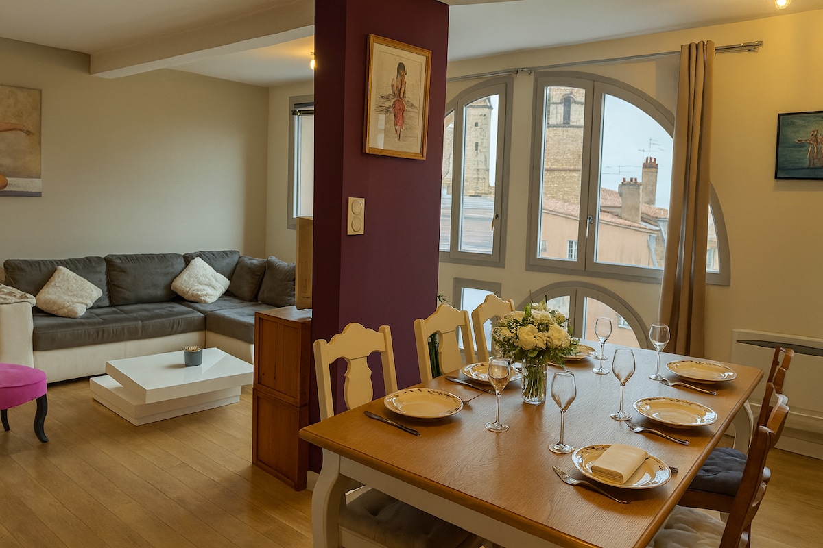 In Mâcon downtown, in a quiet place with a view over the oldest part of the city, our beautiful appartment up to 8 people is welcoming you ! All amenities are within a short walk range : shops, pubs, restaurants and many more. What's more, the Saône river is accessible by walk (5 min) and will instantly take you into the typical Burgundy ambiance ! The appartment includes all equipments needed to have a great time in our beautiful town !