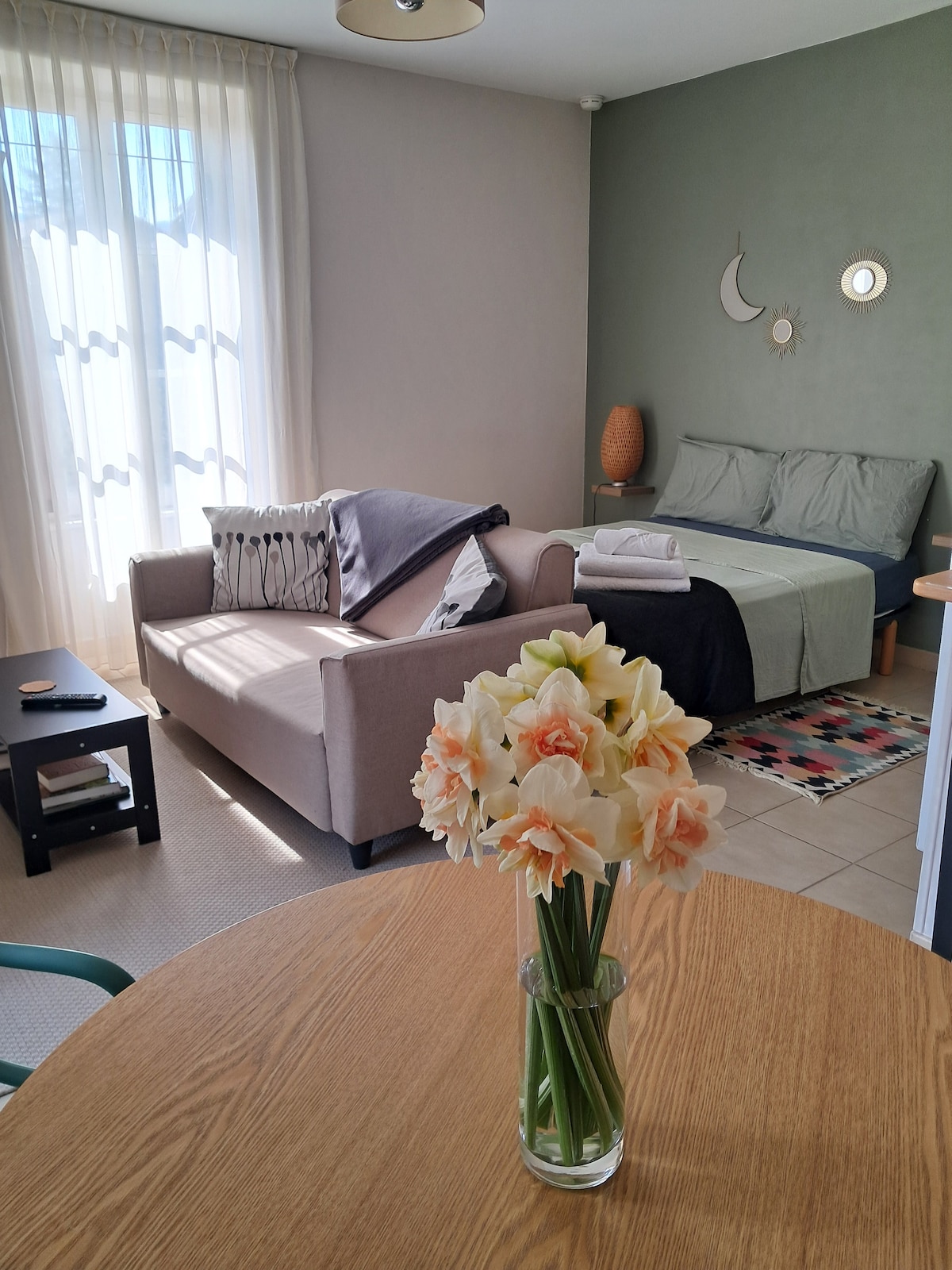 Mesures particulières COVID 19 mises en place pour protection des voyageurs et hôtes. La parenthèse inattendue se situe dans une cour commune, au calme verdoyant. A 10mn de Mâcon centre et près de la gare TGV, péages autoroute et RCEA. Nous habitons sur place et pouvons conseiller les voyageurs pour découvrir la région. Visite cave et dégustation, ferme caprine et bovine. Voie verte à proximité. possibilité de prêt vélos Bibliothèque partagée. Jeux de société. Prix : 100 euros la nuit