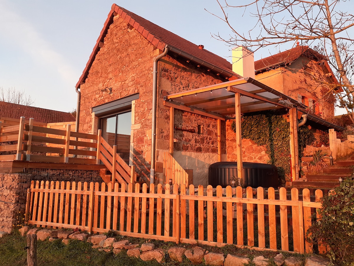 Gîte indépendant 4 personnes, spa privatif extérieur. Au rez-de chaussée, pièce à vivre avec cuisine toute équipée (frigo, lave-vaisselle, combiné four micro-ondes, cafetière Senséo, bouilloire, grille-pain, appareil à raclette, aspirateur balai), coin salon avec canapé lit et TV. A l’étage, une chambre lit 140X190 et une salle de douche-wc (sèche-cheveux, lave-linge). Linge de lit et de toilette fourni. A l’extérieur, une grande terrasse avec vue panoramique, un spa privatif 4 personnes.