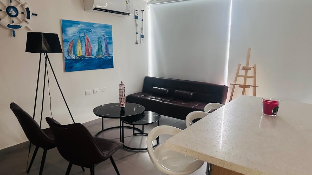 Precioso departamento de una habitación a 200 metros de la playa de Chipípe (Se puede ver desde el Salón), Tiene 1 habitación equipada con Smart TV , Salón con cocína abierta tipo americana, 1 sofá cama y el área de comedor o espacio de trabajo. Esta equipado con A/C Split en las 2 estancias aunque es un departamento bastante fresco. El barrio es tranquilo muy cerca de la base naval y a 500mts de los bares y restaurantes de Chipipe. No te lo pierdas!