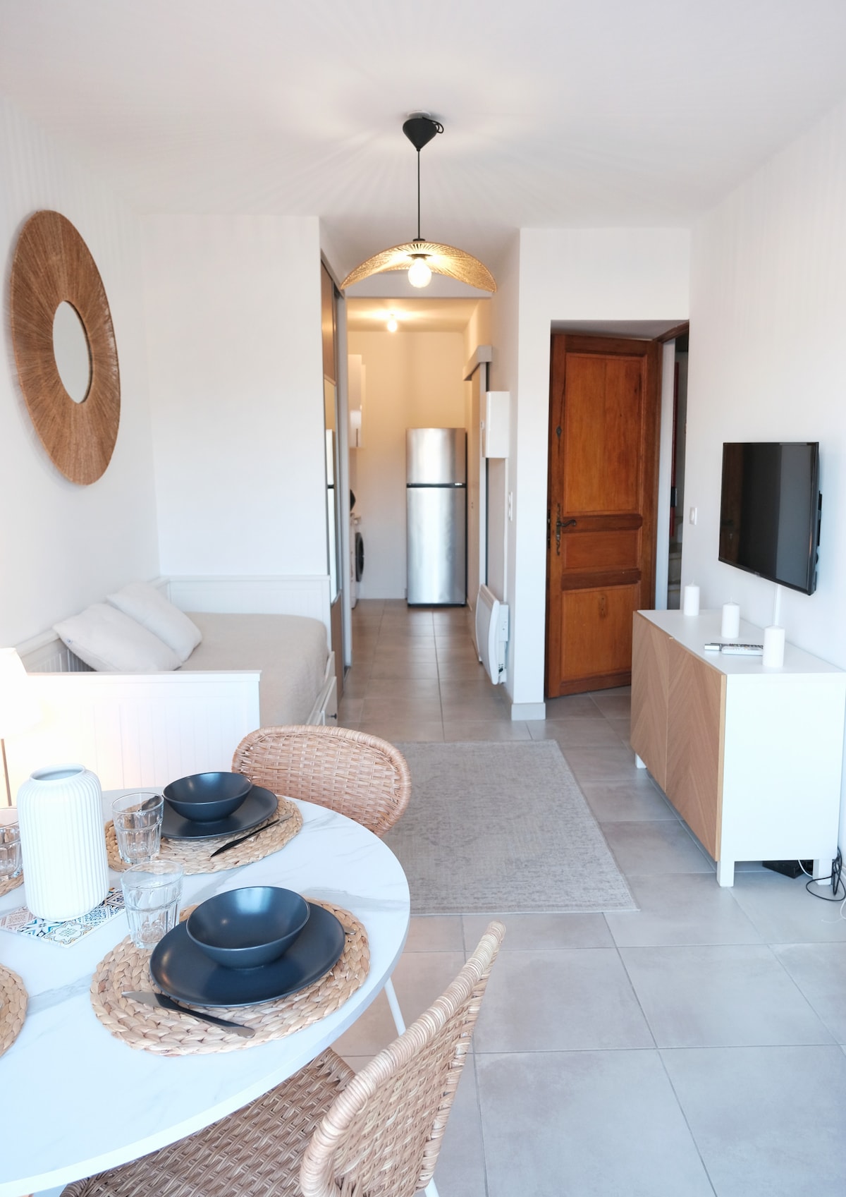 Joli T2 de 25 m2 au 1er étage ( sans ascenseur ) avec coin couchage séparé , espace très bien optimisé. Rénové de juin à août 2019. Déco pleine de caractère avec tomettes au sol d’origine, carreaux ciment dans l’entrée de l’immeuble, carreaux marocains dans la salle de bain. Emplacement idéal, centre ville historique face au Café de l’horloge ouvert 7/7. Literie de qualité, matériaux méditerranéens.