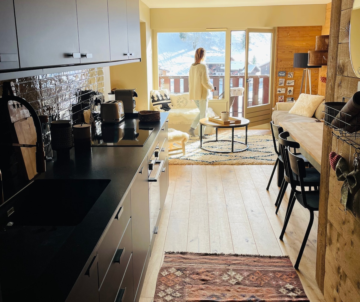 Appartement rénové tout confort alliant esprit montagne et modernité, idéalement situé à 150 m de la piste des Riffroids et à proximité immédiate du village et des commerces. Petite résidence calme dans un secteur privilégié de la station avec l’atout d’avoir un Parking privatif extérieur. Vue dégagée sur les montagnes et les pistes de skis. Espace extérieur avec balcon plein Sud.