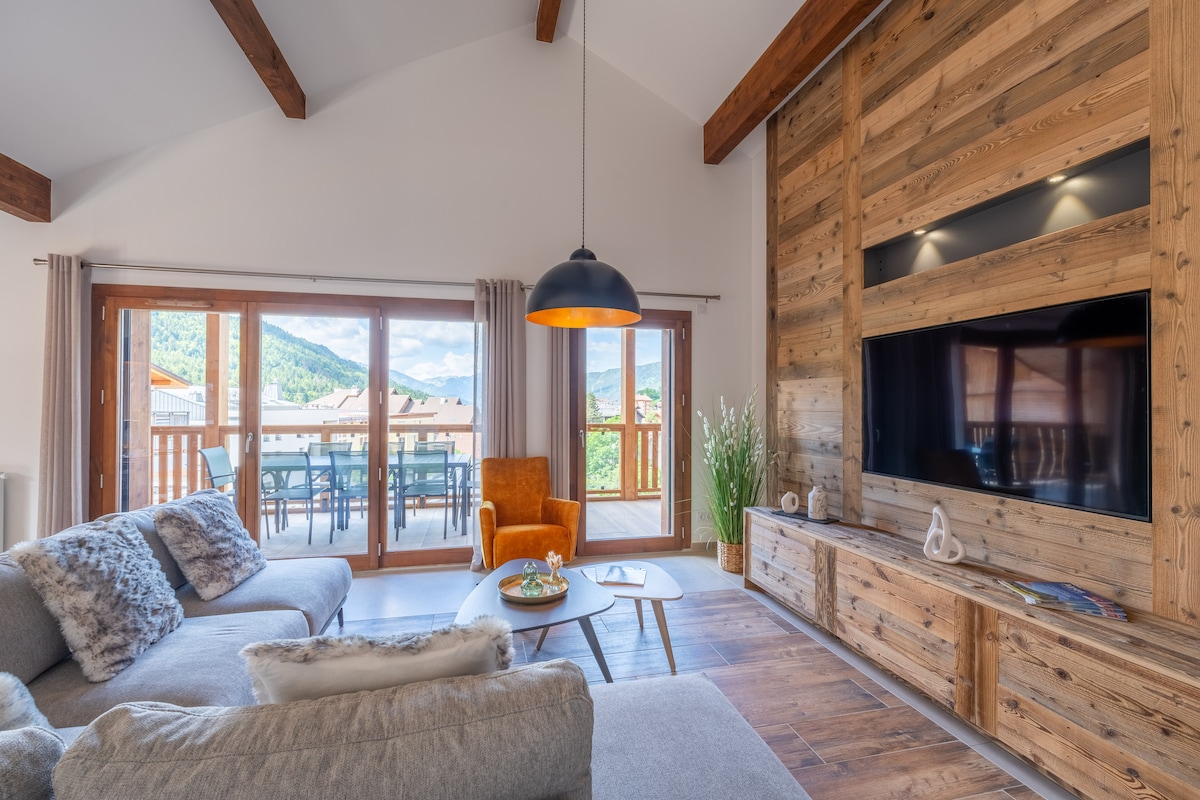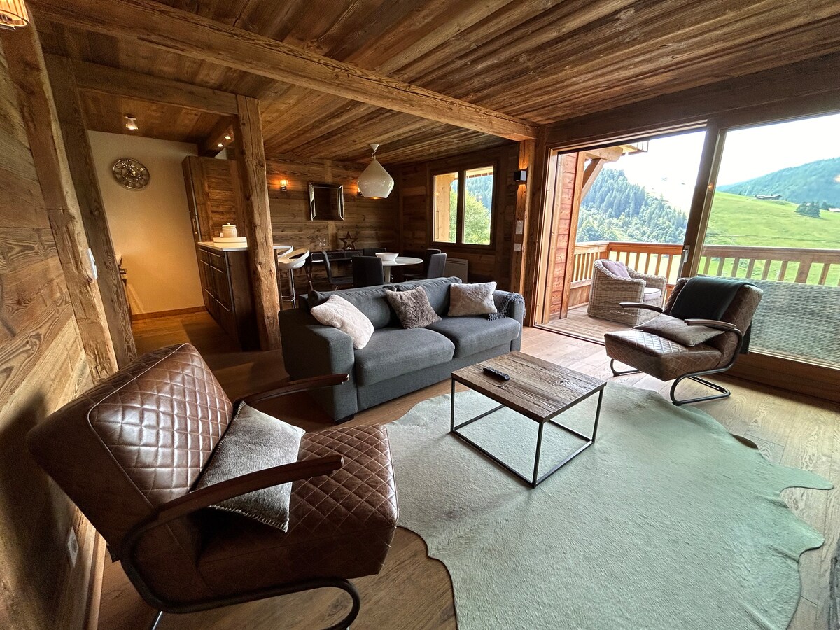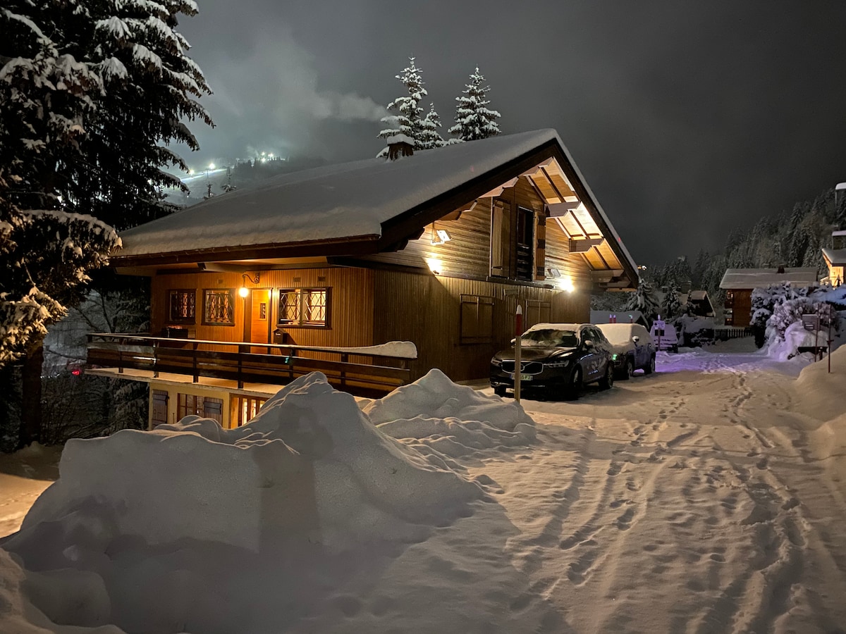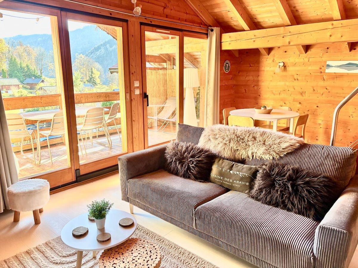 Notre chalet tout confort (classé 5* Meublé de Tourisme) se situe à 1400 mètres d'altitude assurant ainsi un enneigement optimal l'hiver. De la vaste terrasse, une vue à couper le souffle sur la chaîne des Aravis et une luminosité sans pareil tout au long de l’année. L'hiver, vous êtes à 1 km des pistes accessibles par une navette skibus gratuite juste sous le chalet. Un parking extérieur spacieux permet d'accueillir trois voitures avec pneus neige obligatoires.