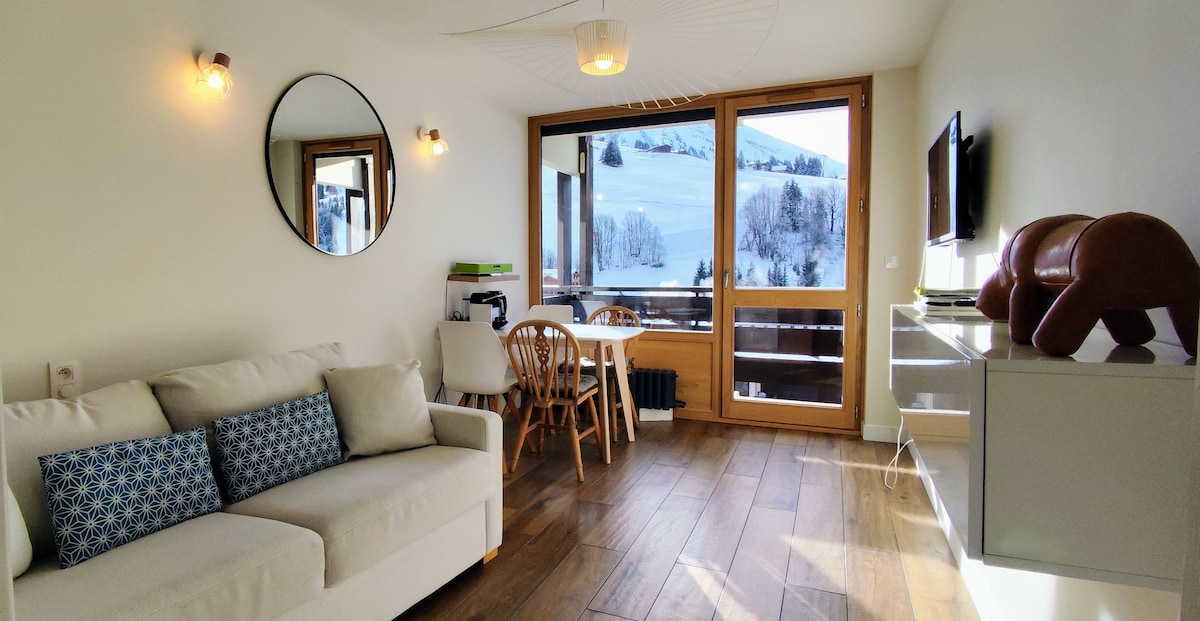 Appartement rénové tout confort alliant esprit montagne et modernité, idéalement situé à 150 m de la piste des Riffroids et à proximité immédiate du village et des commerces. Petite résidence calme dans un secteur privilégié de la station avec l’atout d’avoir un Parking privatif extérieur. Vue dégagée sur les montagnes et les pistes de skis. Espace extérieur avec balcon plein Sud.