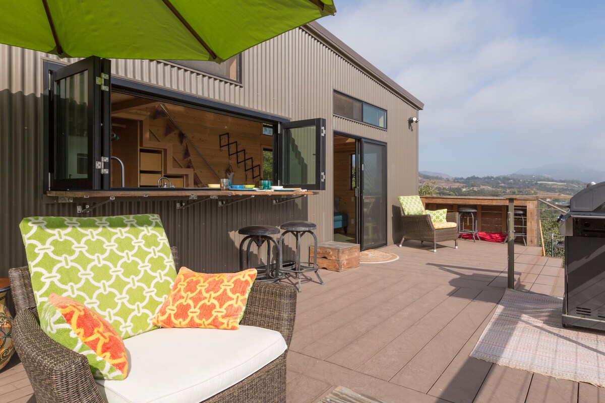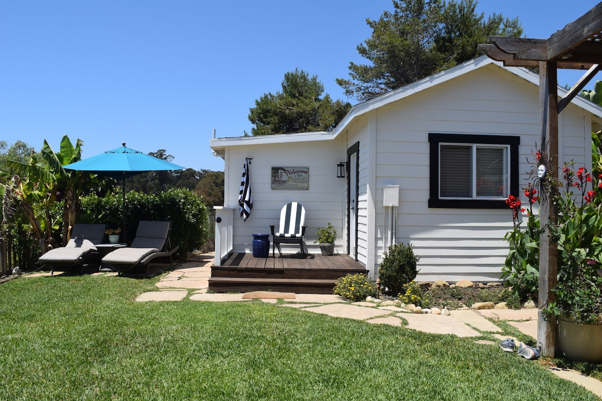 One mile from downtown Carpinteria and the state beach. Custom designed 320 sqft tiny home with a 400 sqft deck for perfect indoor/outdoor living. A relaxed and comfortable place to stay with full sized appliances, tall ceilings and 2 sleeping lofts. Plenty of space for 1-2 people, a small family, or 4 adventurous people. The large cantina window allows for beautiful natural light and easy access to deck seating. Pets welcome! Large 1/2 acre fully fenced yard surrounding living space.
