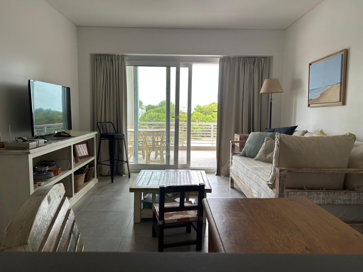 Amplio y luminoso departamento equipado con losa radiante y aire acondicionado frío/calor en living y dormitorio muy bien ubicado con vista panorámica al golf y a solo metros del Club House. Cuenta con terraza y parrilla propias, sillas de playa, sombrilla, cochera subterránea y laundry. También cuenta con MOSQUITEROS. Pileta in-out y acceso a todos los servicios del barrio: tenis, fútbol, golf, polo, caballos, paradores de playa, Club House, proveeduría, paseo comercial y seguridad 24 hs.