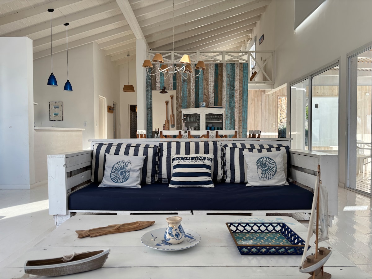 A 2 minutos del mar. 230 mt2. 4 dormis, 2 en suite. Detalles Premium. Planta alta con exclusivo dormitorio en suite, con terrazas y baño( bañera). Abajo 3 cuartos. Importante living-comedor con aire acondicionado. Parrilla. Terrazas. Solarium. Hecha con materiales puros y alta calidad. Entre pinares. Muy Cómoda y aroma a maderas. Ideal para disfrutar en verano y en invierno. Una cocina con isla. Lavadero. Ducha exterior Y todo elegido amorosamente. Matrimonios consultar precio. Sin ropa blanca