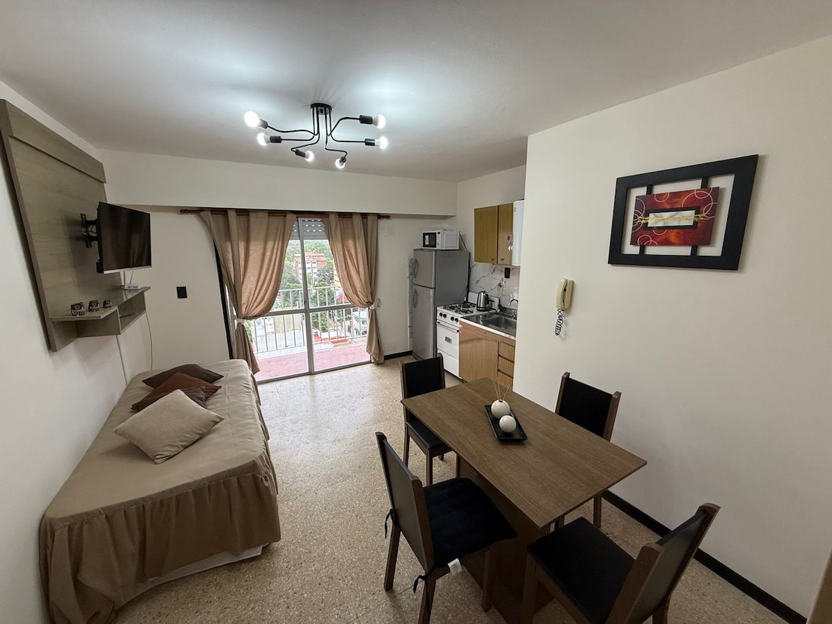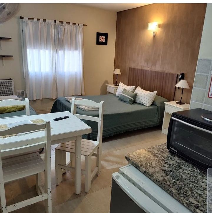 Monoambientes con kitchinette equipada con anafe de dos hornallas a gas, microondas, horno eléctrico, heladera, vajilla y utensilios de cocina, cafetera eléctrica, pava eléctrica, tostadora eléctrica. Tambien cuenta con TV LED de 32 pulgadas, Tv x cable, wifi, calefacción por tiro balanceado, ventilador y secador de cabello. Frazadas y acolchados, sábanas, toallas y toallones, jabón, shampu y papel higiénico. Parque, estacionamiento y parrillas.