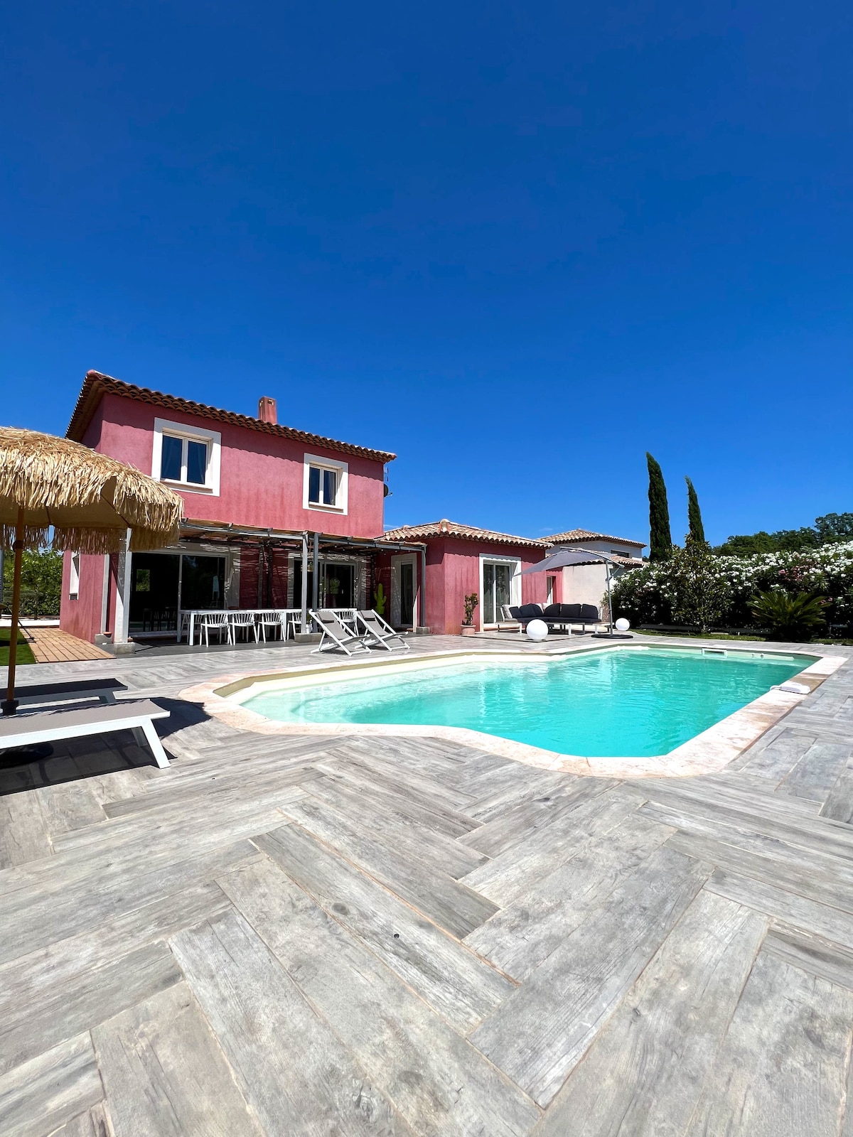 Maison de 180 m2 entièrement climatisée, aucun vis-à-vis, calme absolu : Une terrasse de 120 m2, un grand jardin (1300m2), un sauna, des jeux pour enfants, baby foot, table de ping pong, terrain de boules, barbecue salon de jardin, transats, une piscine privative chauffée (uniquement en avril/mai/juin et septembre/octobre) exposée plein sud (10*5) bar extérieur. Garage double. WIFI incluse... Les évènements ou fêtes causant des nuisances sonores au voisinage ne sont pas autorisés
