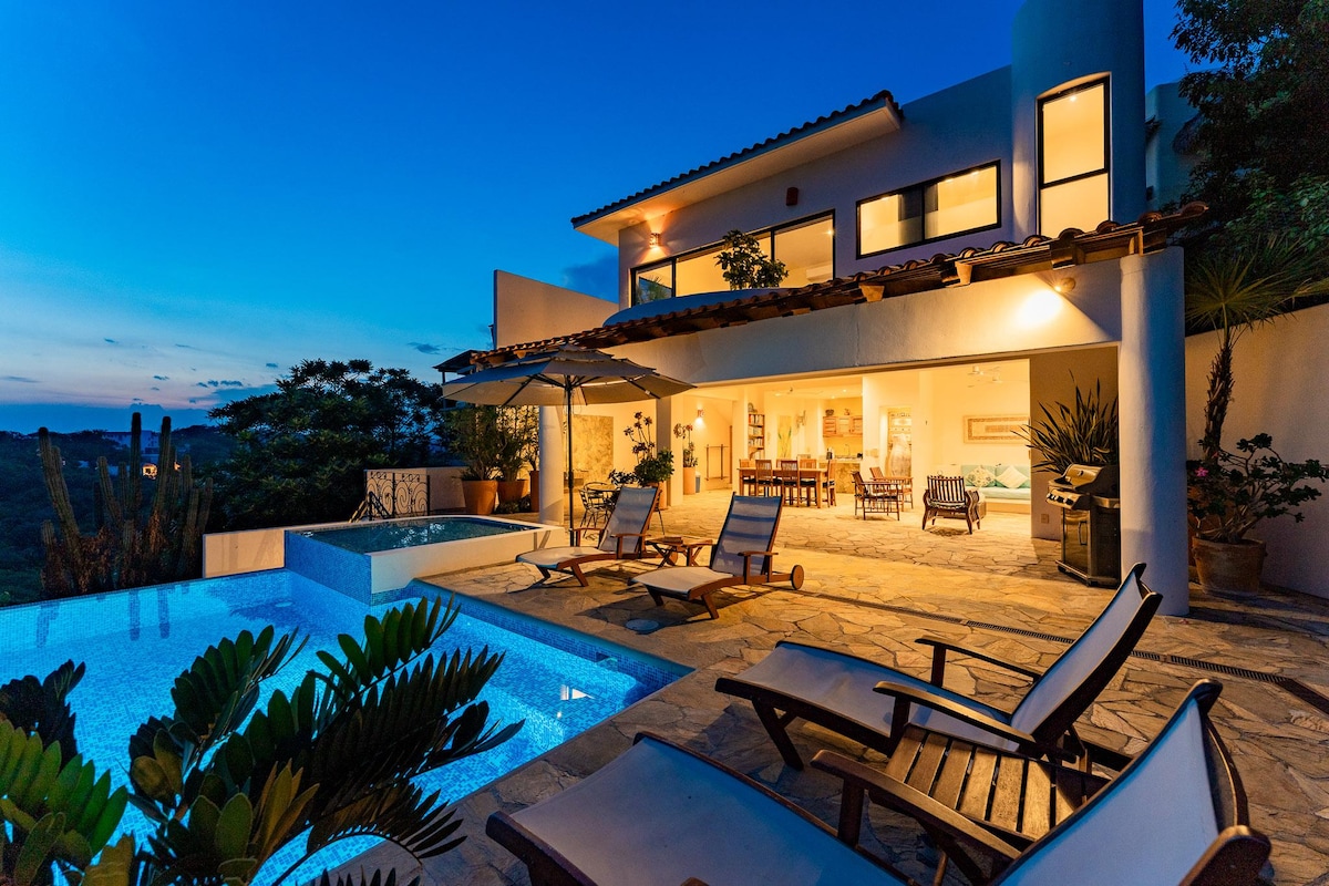 Enjoy the beauty and serenity of this luxury 3 bedroom, 3 bathroom home in Sector 0 in the quiet and peaceful community in Huatulco. Close to the airport, just 5 minutes from beaches,restaurants and vibrant culture of nearby town. Take in your days relaxing around the large pool shared by 3 other homes. With a covered palapa equipped with everything needed to enjoy the warmth and beauty. Perfect for families or groups. Cleaning services, on-site security and grocery services available.