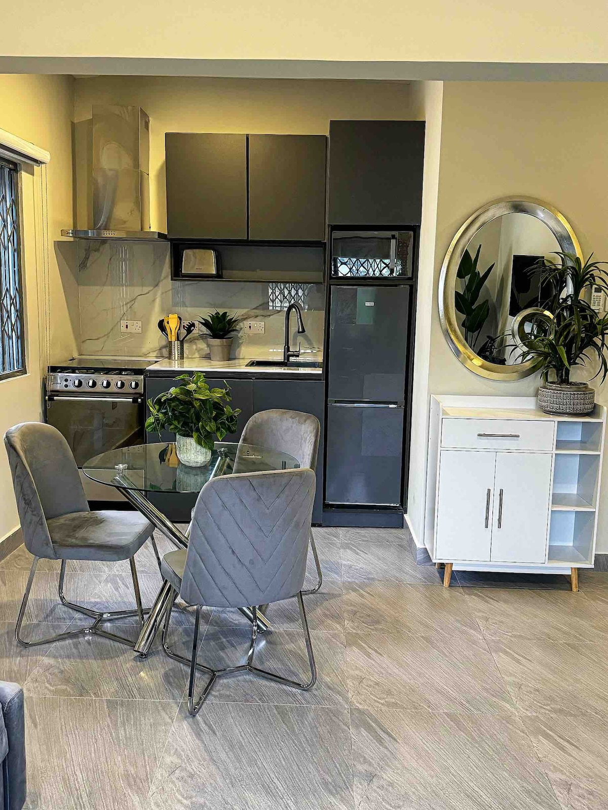 Welcome to your private 1-bedroom guesthouse in Cantonments, one of Accra’s most secure and desirable neighborhoods. This modern retreat offers a bright bedroom with queen bed, cozy living area with smart TV, sleek bathroom with hot water, and a fully equipped kitchenette. With air conditioning, reliable high-speed WiFi, and 24/7 security, you’ll enjoy both comfort and peace of mind. Just minutes from embassies, restaurants, malls, and Kotoka Airport.