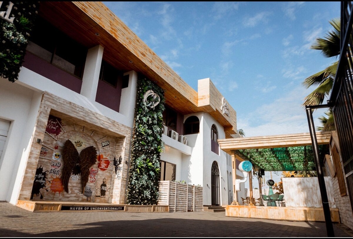 An unconventional space with a beautiful room and bathroom. Our space is more than your regular guest house, but also has a coffee shop, a restaurant and bar, a hair salon, pedicure spa, nail salon and much more.