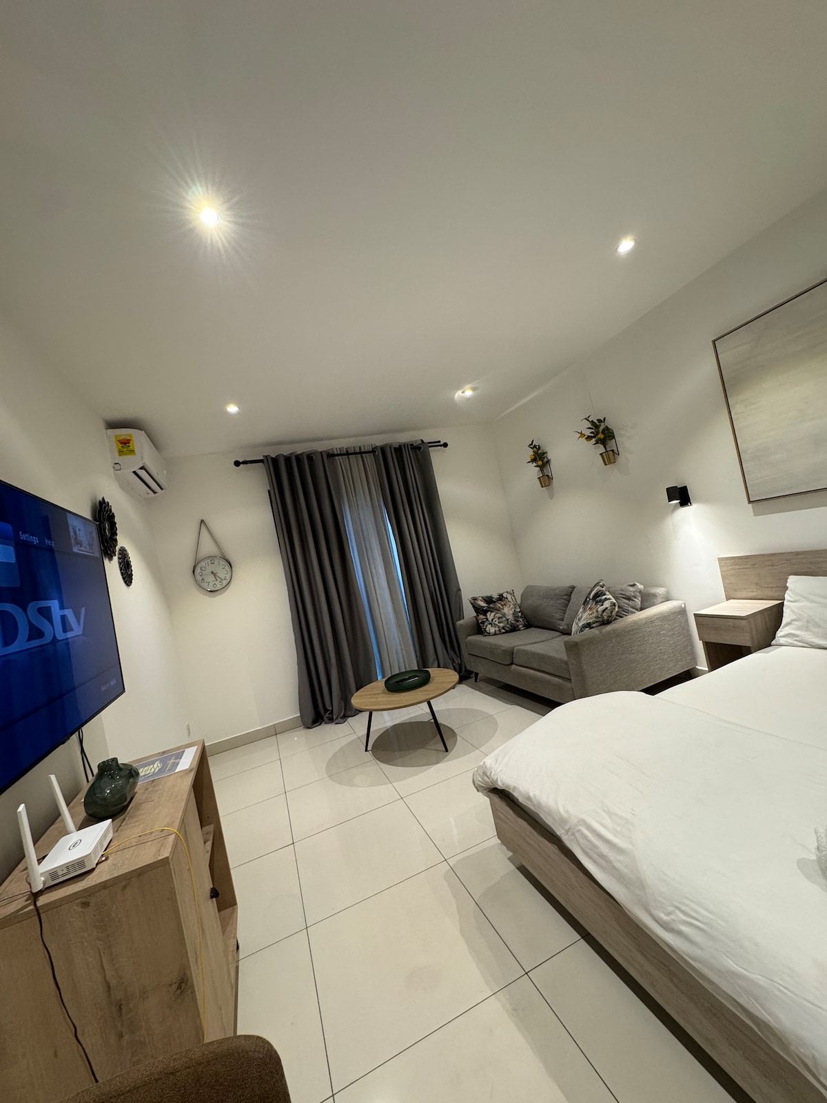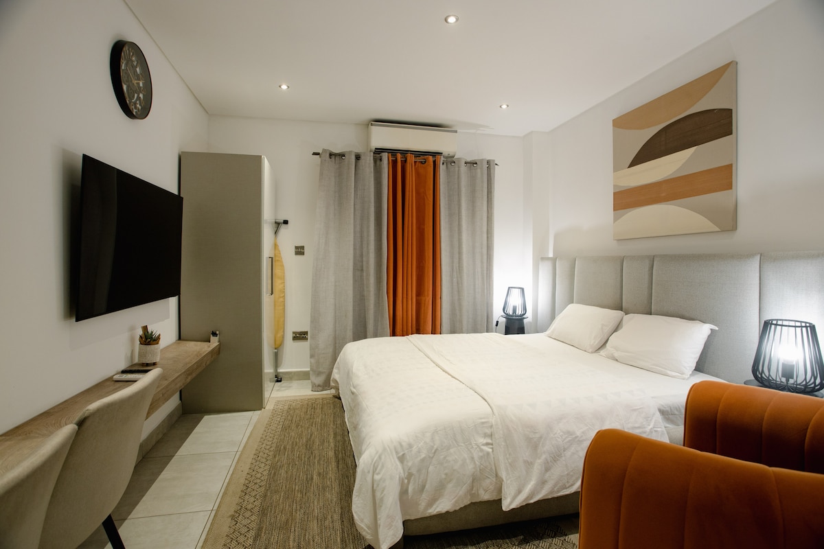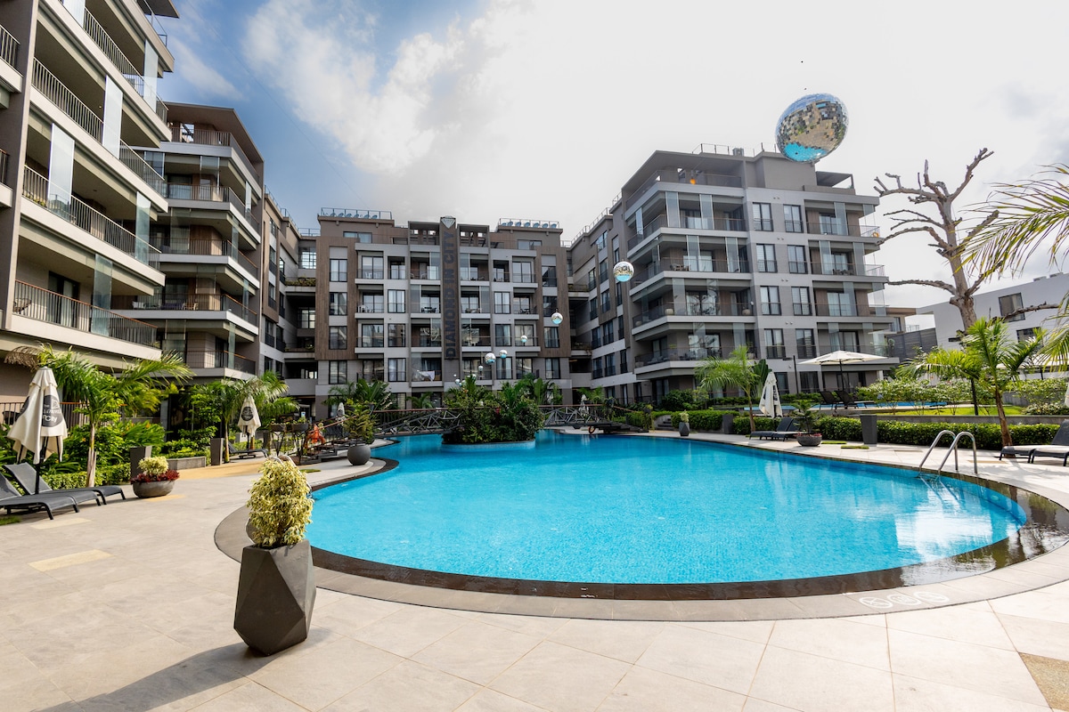 Your extraordinary Accra experience begins here. Book now and see why guests say ‘home away from home only gets better.’ Access to rooftop pool and gym. This stylish unit in Airport Residential offers hotel-level comfort. Enjoy a queen bed, vibrant yellow sofa, smart TV, fast Wi-Fi, cool AC, kitchenette, and a calm balcony. Walk safely to Airport City, restaurants, malls, cafés and Roman Ridge. 5-10 mins drive to airport. Perfect for business travelers, couples, solo guests and weekend escapes