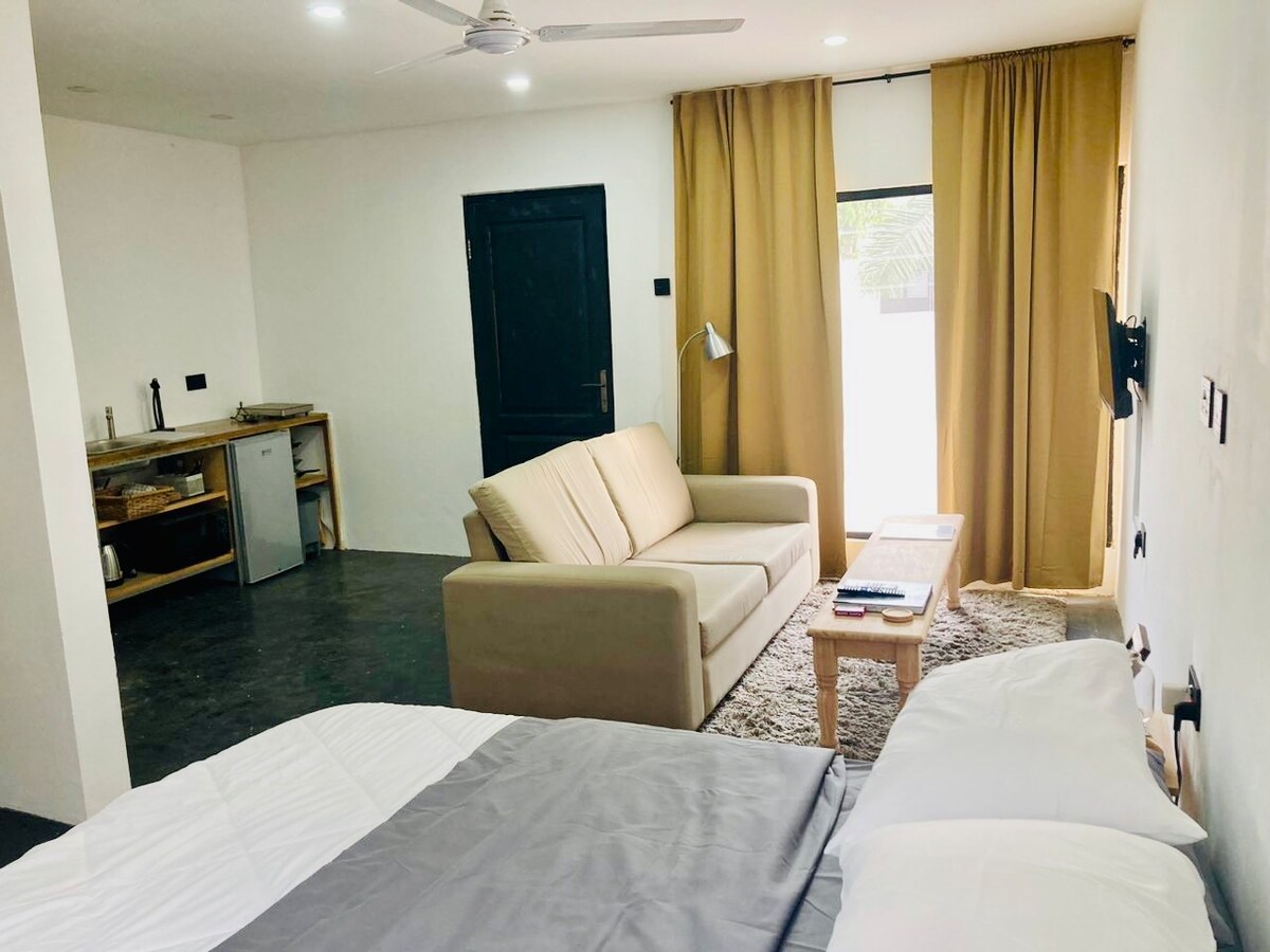 Sankofa Studio Suite at Grayson Court is in the prime neighborhood of North Ridge, Osu. This safe and convenient location is perfect for your stay. Studio offers a double bed, couch, kitchenette, desk, and full bath. Our walled compound has security cameras and a full-time caretaker on site for added security and assistance. Near Jubilee House, 15 minutes from the airport, walking distance to Oxford St., close to shopping, restaurants, and AfroFuture, this prime location cannot be beat!