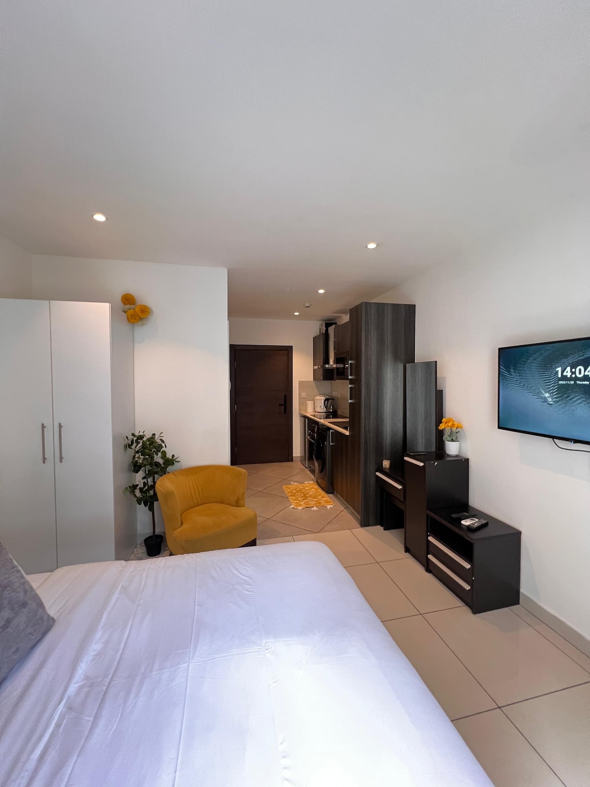 Experience the comfort of this luxurious one-bedroom suite, offering exceptional value just a 10-minute drive from the airport, Osu, Accra Mall, and Cantonments. Enjoy nearby restaurants and shopping within walking distance. Suite features a rooftop terrace with airport views, an outdoor dining area on the ground and rooftop levels, a swimming pool, reliable Wi-Fi, 24h power supply and security. Centrally located in East Airport, at the heart of Accra, it’s thoughtfully designed for your comfort