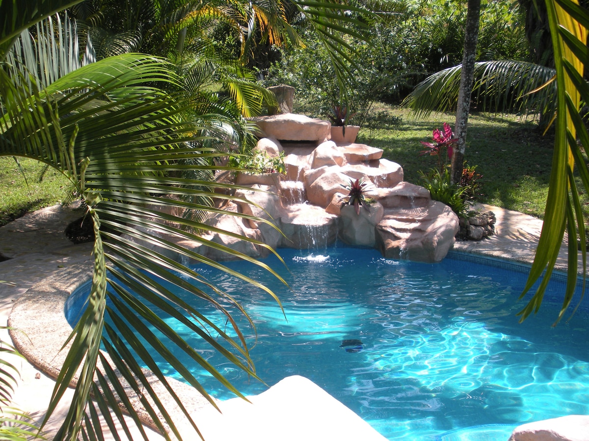 Perched in the Treetops over a Natural 9 ft. deep Jungle Pool, our Treetop is fully Screened for Bug free Living! Sitting room on first level and a screened bedroom with small screened veranda on 2nd level. A futon accommodates a child (7 yrs. or older) on 1st level. The Treetop shares a Common area (50 ft. away) with no more than 2 other guests and includes Hot water, WiFi, Full Kitchen Facilities with dedicated fridge for the Treetop, toilet, sinks, and shower , Dining Gazebo