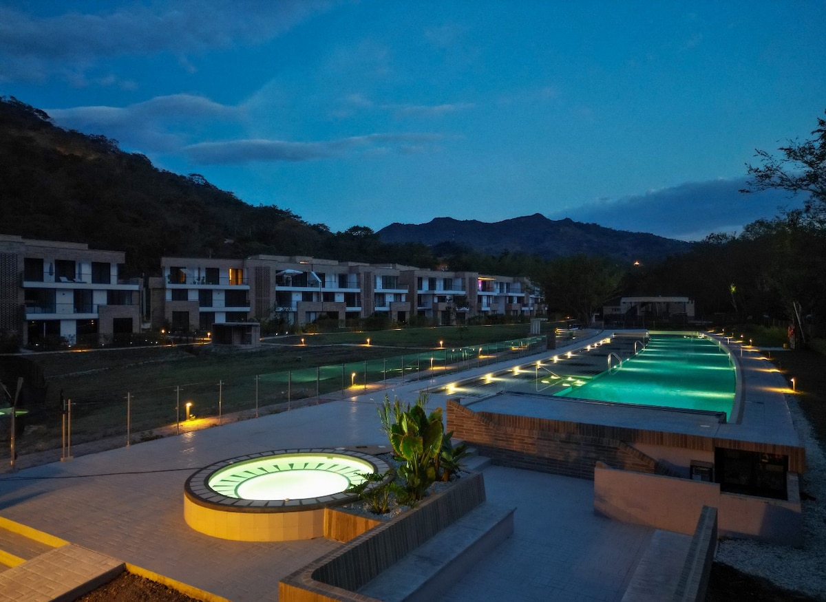 Escape to a hidden retreat in the mountains and feel the life of the tropical forest. Relax in the 10-person jacuzzi—by day with nature views and by night under a starry sky. Enjoy A/C, a fully equipped kitchen, terraces, outdoor cinema, a scenic viewpoint, hiking trails, a firepit, indoor spa, and badminton court. Just 10 minutes from Honda’s historic center, your perfect refuge to disconnect without being far away.