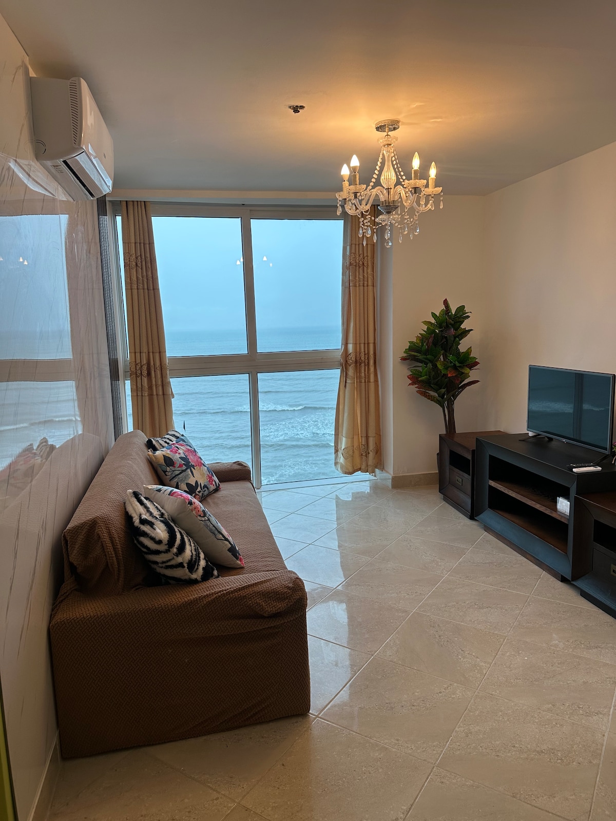 Relájate con tu pareja o familia en este alojamiento tranquilo donde contemplas el mar en cualquier parte del apartamento. También puedes disfrutar del área social y áreas para tomar sol o descansar, mientras contemplas el mar y playa. El estacionamiento es privado, gratis y con seguridad 24 horas, con portón controlado en la garita del edificio. La tienda más cercana se encuentra a 2 km por si requieres hacer algunas compras como bebidas u otro comestible. Wifi abierto.
