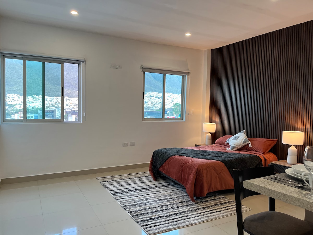 Loft moderno ubicado en las faldas del Cerro de la Silla, Hermosas vistas panoramicas a las montañas y a la ciudad. Colonia privada y 100% segura, cerca de zonas comerciales y las principales avenidas de la ciudad, a 15 minutos del centro de Monterrey, de Parque fundidora, de San Pedro y de Santiago. Mobiliario 100% nuevo, terraza totalmente privada al aire libre. Con lo necesario para asegurar suministro de agua las 24 horas del dia. Contamos tambien con excelente recepcion de internet.