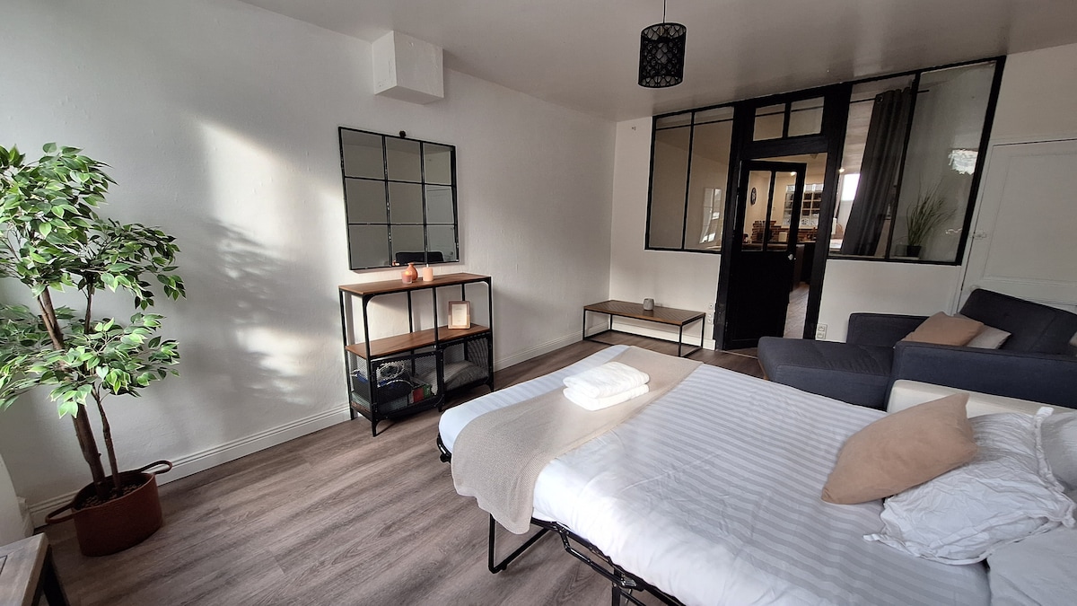 Logement neuf,, finement décoré, de grands espaces à l'intérieur comme à l'extérieur. Cadre verdoyant et calme. proche canal. Décoration et mobilier tendance. Cuisine equipée ouverte sur espace repas, grande table. Coin salon canapé, télévision, Internet WiFi. Grande chambre au rez-de-chaussée pour 2 personnes et une grande chambre à l'étage avec un lit d'une personne. .Grande terrasse plein sud et mobilier de jardin. Car port deux voitures. Proche centre 5 min., autoroutes.