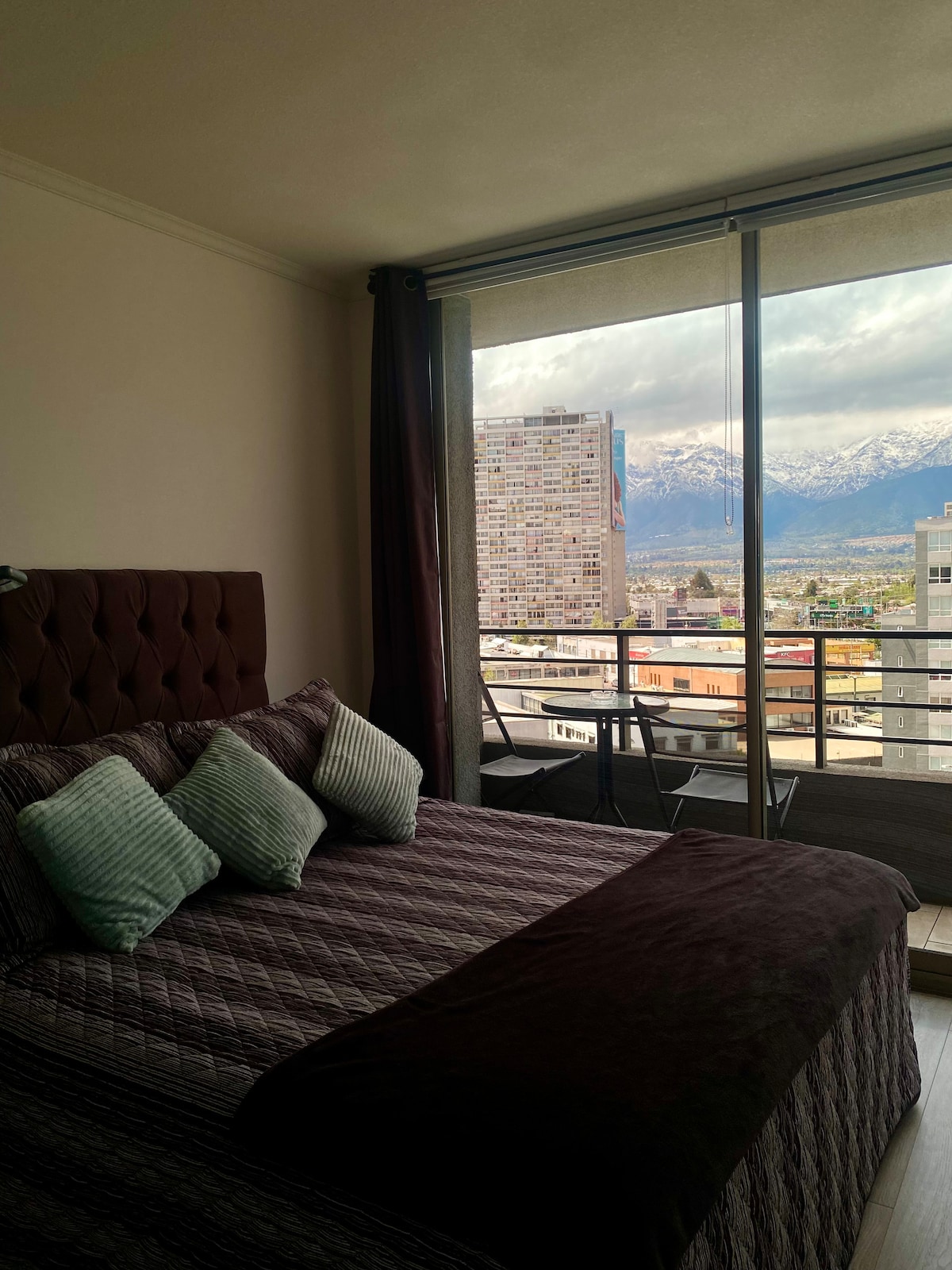 Moderno depto. con hermosa vista cordillera Ubicado en sector céntrico y tranquilo, a 500 mts del metro Bellavista, 700 mts del Mall Plaza Vespucio, 800 mts de Clínica Dávila, 20 min del aeropuerto, 10 min del Estadio Bicentenario y 7 min del Estadio monumental. 1 habitación + sofá cama en el living Cocina equipada Baño privado Balcón con vista a la cordillera WiFi y TV con aplicaciones Completamente equipado Moderno, cómodo y minimalista Piscina, gimnasio, quincho, co-work y salón de eventos