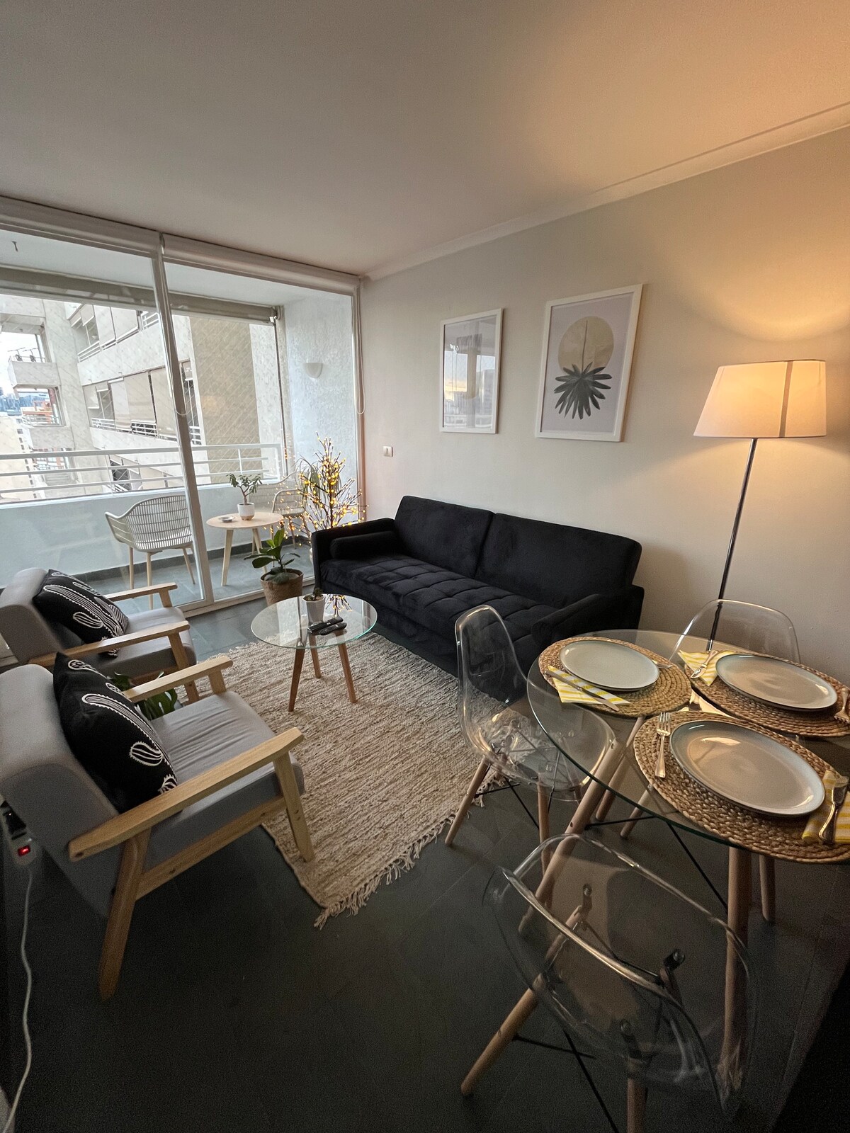 Con estacionamiento comodo y moderno departamento ubicado en una zona tranquila, ideal para familias, parejas o viajeros por trabajo. Totalmente equipado : 2 dormitorios (principal con cama matrimonial, segundo con cama individual) y sofá cama para 1 persona en living. 2 baños completos Cocina equipada con horno, microondas, refrigerador , lavadora y utensilios. Living comedor con TV, WiFi y balcón.Estacionamiento privado incluido y piscina. Muy cercano a metro y Mall Plaza Vespucio.