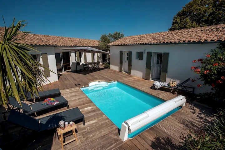 Villa d’exception au Bois-Plage-en-Ré – Piscine chauffée & accès plage à pied Idéalement située à 50m de la plage, cette maison sans vis-à-vis, exposée plein sud, peut accueillir jusqu’à 10 voyageurs. Avec 5 chambres, 4 salles de bain, elle est parfaite pour les familles et groupes d’amis. À 800m du centre-village, commerces et restaurants sont accessibles à pied ou à vélo. À votre disposition une piscine chauffée, un terrain de pétanque et un jardin paysagé pour un séjour inoubliable !