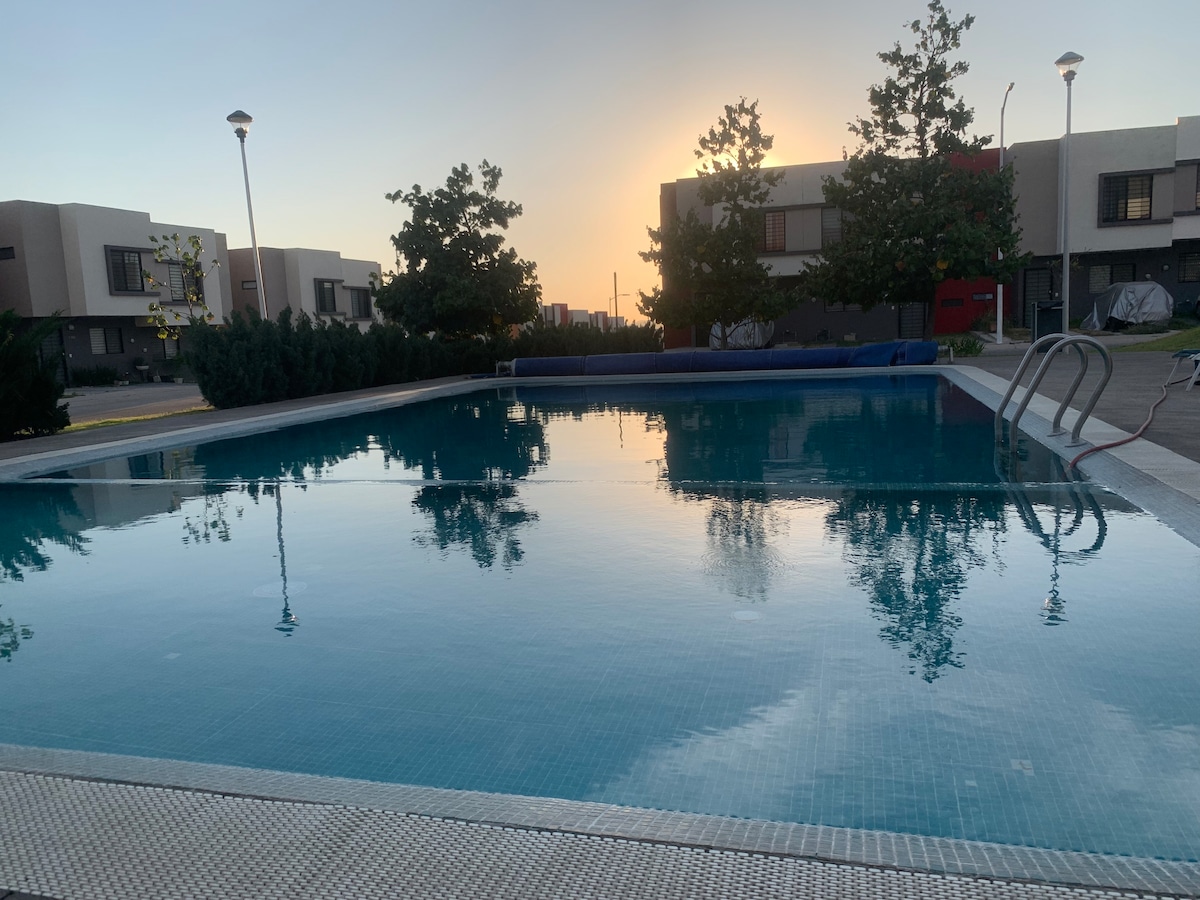 Relájate con toda la familia en este alojamiento donde la tranquilidad se respira, podrás disfrutar de todas las comodidades y amenidades que deseas. Contamos con 3 habitaciones, 2 en planta alta con closet y 1 en planta baja. 1 baño arriba y medio abajo. Cocina equipada para tu comodidad. Comedor amplio para disfrutar en familia. Sala con TV. Patio trasero con lavadora. Cochera techada para 1 auto vehículo grande o 2 pequeños. Alberca en un ambiente familiar (alberca compartida)