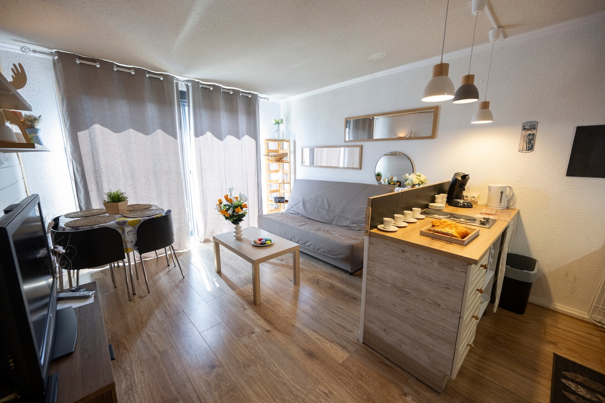 Appartement rénové pour des vacances paisibles. Situé dans la résidence des balcons du soleil, 3ème expo SUD, le soleil rentrant est apprécié été comme hiver. Idéal famille ou 4 adultes ( 1 chambre lit double et 1 chambre lits superposés ADULTES) Des cloisons et portes phoniques ont été installées pour assurer les grasses matinées. Appartement tout confort avec salon, cuisine équipées, balcon. Proche des commerces (quartier des étoiles), parking gratuit, navette bus en hiver. Animaux refusés