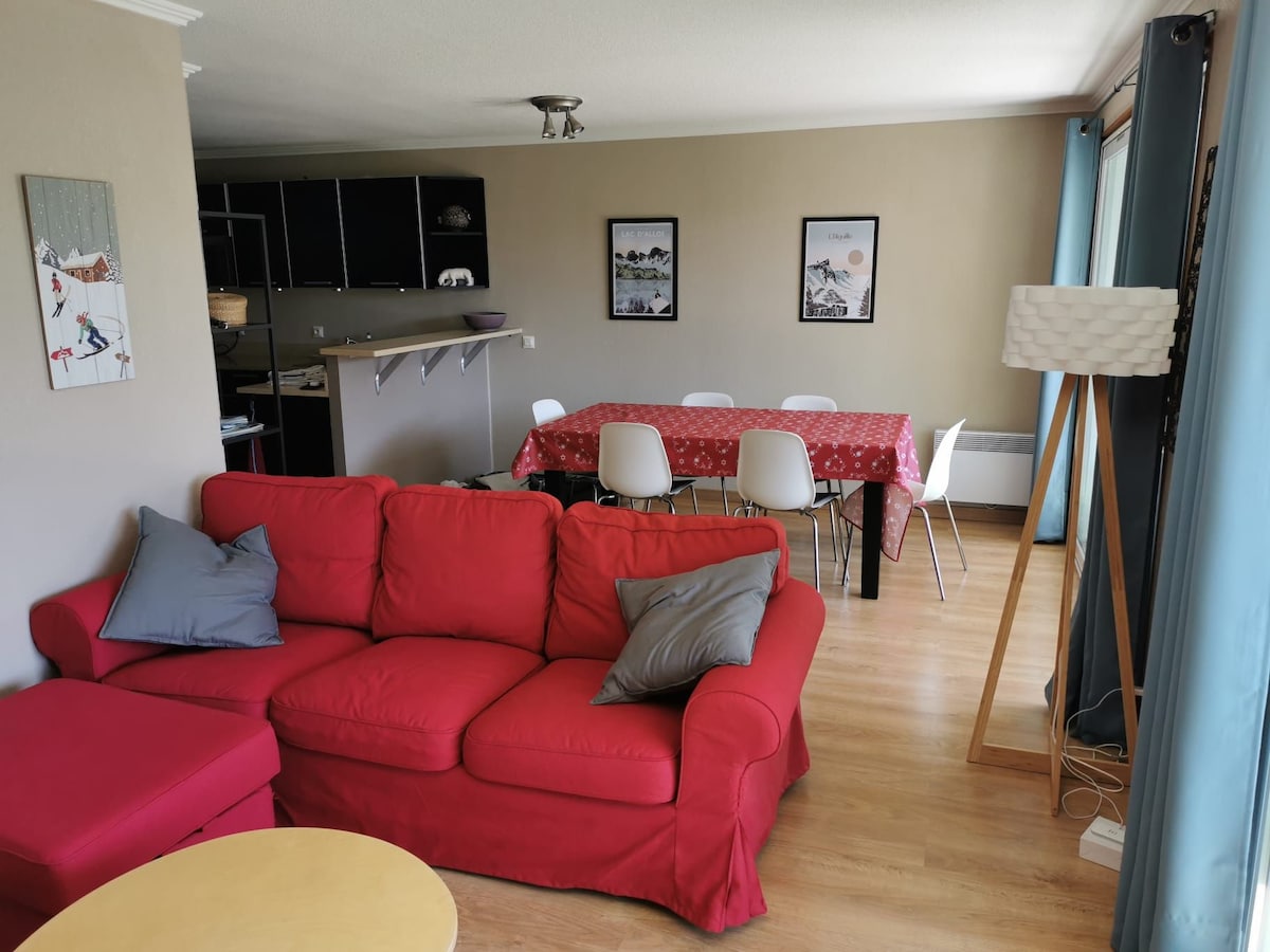 Appartement rénové pour des vacances paisibles. Situé dans la résidence des balcons du soleil, 3ème expo SUD, le soleil rentrant est apprécié été comme hiver. Idéal famille ou 4 adultes ( 1 chambre lit double et 1 chambre lits superposés ADULTES) Des cloisons et portes phoniques ont été installées pour assurer les grasses matinées. Appartement tout confort avec salon, cuisine équipées, balcon. Proche des commerces (quartier des étoiles), parking gratuit, navette bus en hiver. Animaux refusés