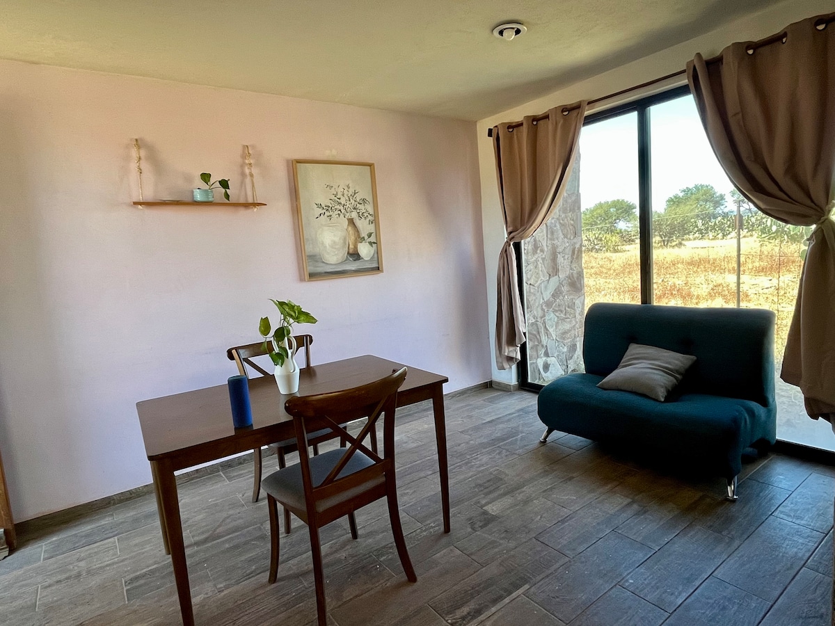 Bungalow para 4 personas situado en el hermoso jardín de cactáceas de una casa residencial dentro de un fraccionamiento privado y seguro a 15 minutos del pueblo de Tequisquiapan. Linda terraza con asador, jardín enorme con hamacas y vistas a los invernaderos y jardín divino. Estacionamiento fuera de la casa, desayuno extra opcional, lavadora y secadora también extra opcional.