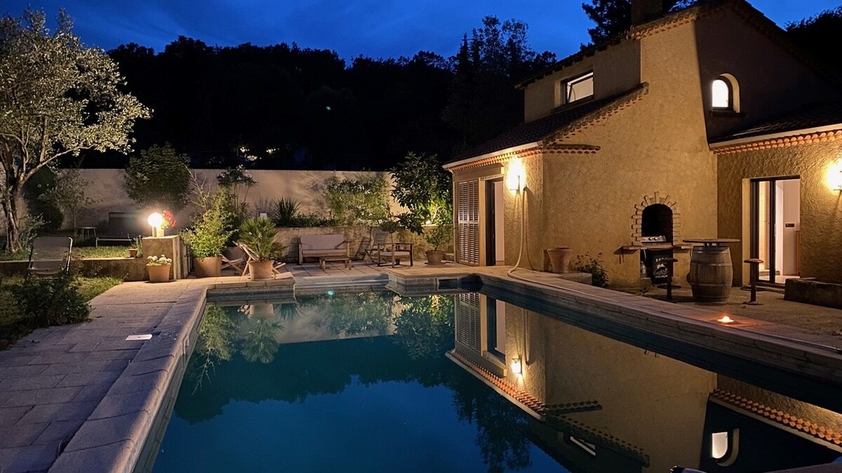Meublé de tourisme classé 4 * : 65m2 dans écrin de verdure. La terrasse privative donne sur une forêt de chênes et de pins avec vue sur les collines. Une chambre avec un grand lit (qualité hotellerie) et une salle de bain attenante + une cuisine ouverte toute équipée et donnant sur un salon avec 2 banquettes-lits simples. Équipement complet, piscine partagée avec les propriétaires Nous serons ravis d’échanger sur les bonnes adresses de la région si les voyageurs le souhaitent.