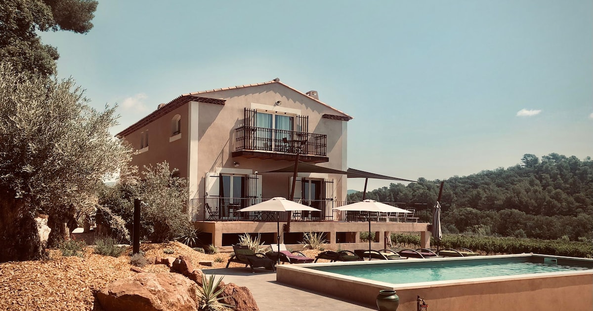 Bonjour, le décor élégant de cet hébergement de charme vous séduira. Le Mas est situé sur une colline au coeur des vignes. Sur un terrain de 5000m2 vous profiterez de la piscine, du terrain de boule et divers espaces de détente (à partager avec d'autres hôtes). A 15 min de la mer et du Castellet, venez vous ressourcer au calme à l'ombre des pins et des oliviers. Possibilité de se promener dans les vignes ou la colline à 2 pas du logement.