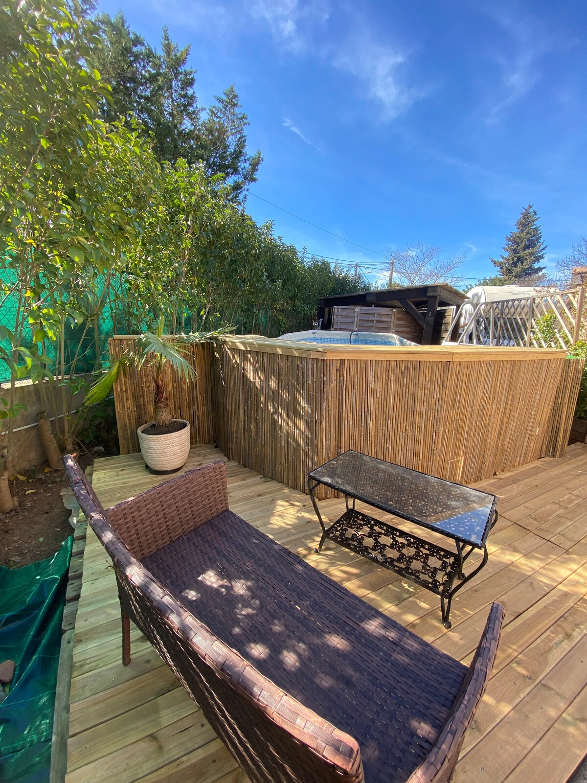 Au cœur du vignoble bandolais à 10min des plages de Bandol ou des Lecques. Studio indépendant, climatisé au calme dans la verdure. Pièce principale de 32 m2 avec 2 canapés et mezzanine de 5 m2 ( lit en 160). Espace bureau, accès Internet WIFI. Cuisine toute équipée , TV et une salle de douche avec WC ainsi qu’un dressing. La terrasse de 22 m2 avec pergola équipée pour repas avec BBA au gaz. Accès gratuit à un lave-linge. Parking et accès privés extérieurs pour votre véhicule.