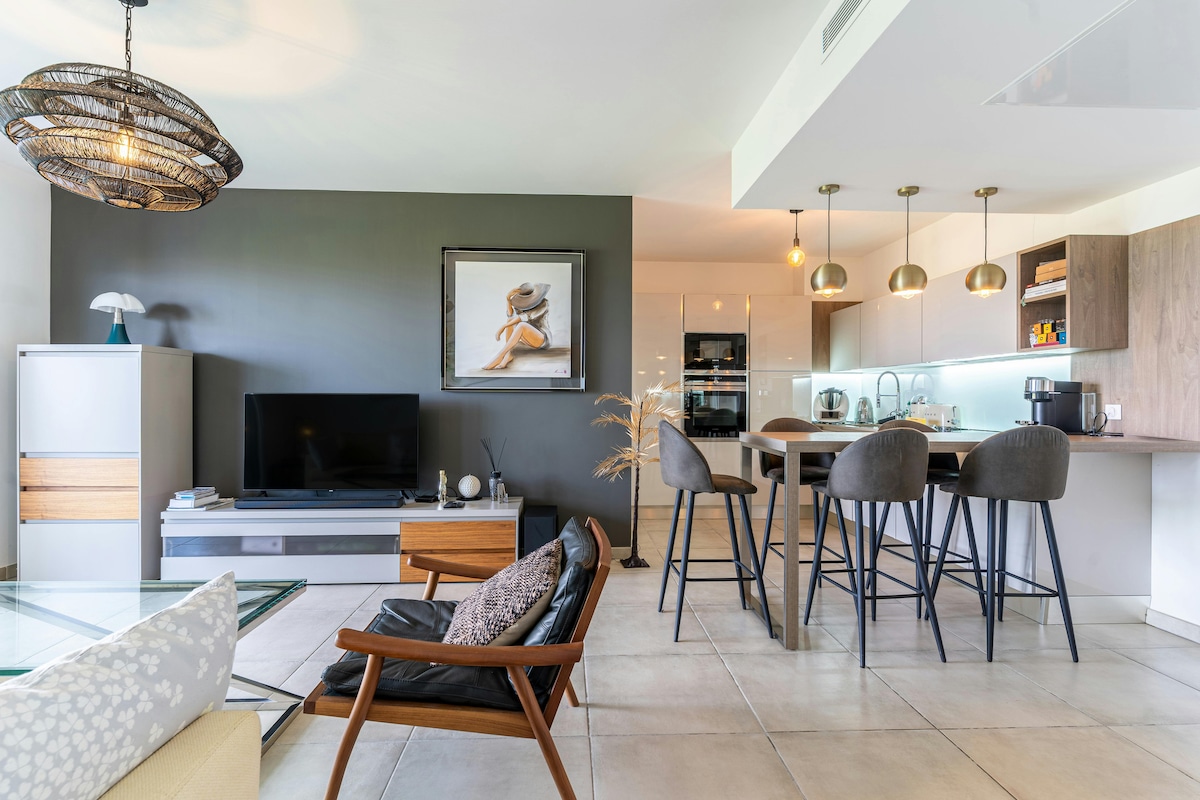 In a green setting, the renovated 85m2 (914 sqft) La Luciole apartment benefits from a private garden of over 1000m2 and 2 parking spaces in a closed property. You will appreciate the calm and the view of the Baous from your terrace but also the idyllic setting of the swimming pool. Located 20 minutes from the airport, 10 minutes from Saint Paul, 10 minutes from Polygone Riviera for shopping enthusiasts and less than 15 minutes from the A8 motorway. The nearest beaches are 15 minutes away.