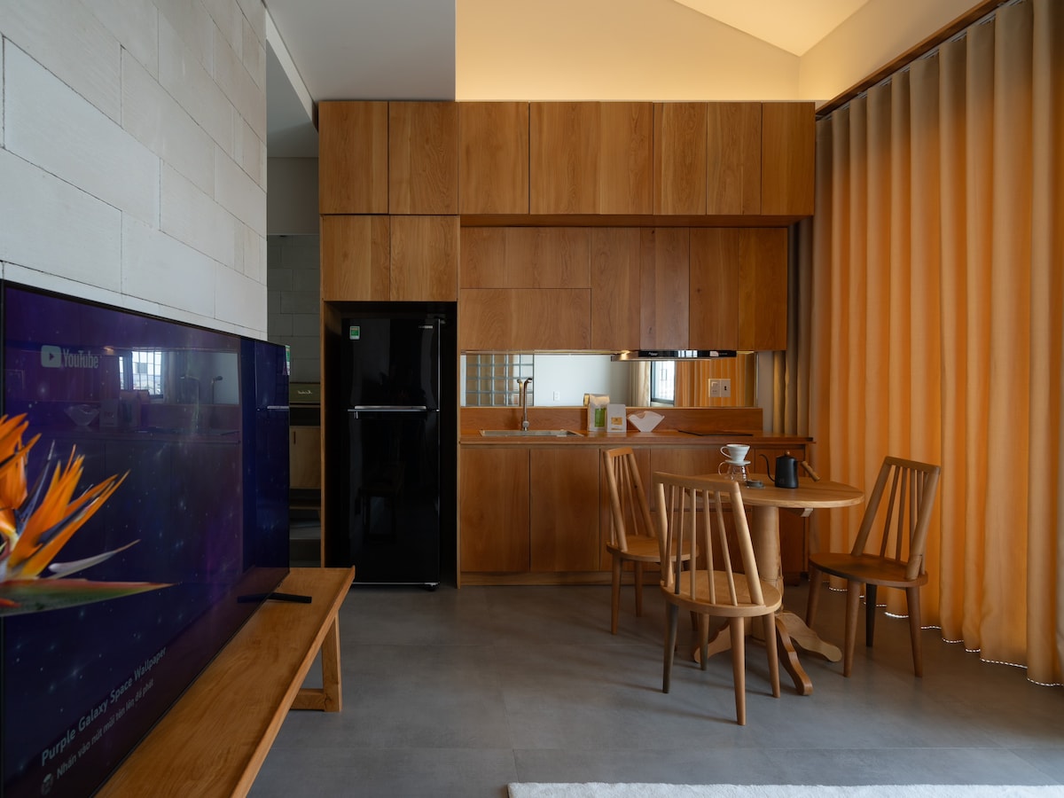 Located in the center of Phan Thiet city, from our place, you can easily access local cuisine, supermarket, coffee, and only 1.5km from Doi Duong beach. This 50m2 studio is located behind a villa, with a private entrance and security with a magnetic key. There is a separate kitchenette, bathroom, washing machine and dryer and an outdoor bathtub. The front yard is a common space where you can park your motorbike.m Other amenities include AC WiFi, TVs, washing, bedsheets and toiletries.