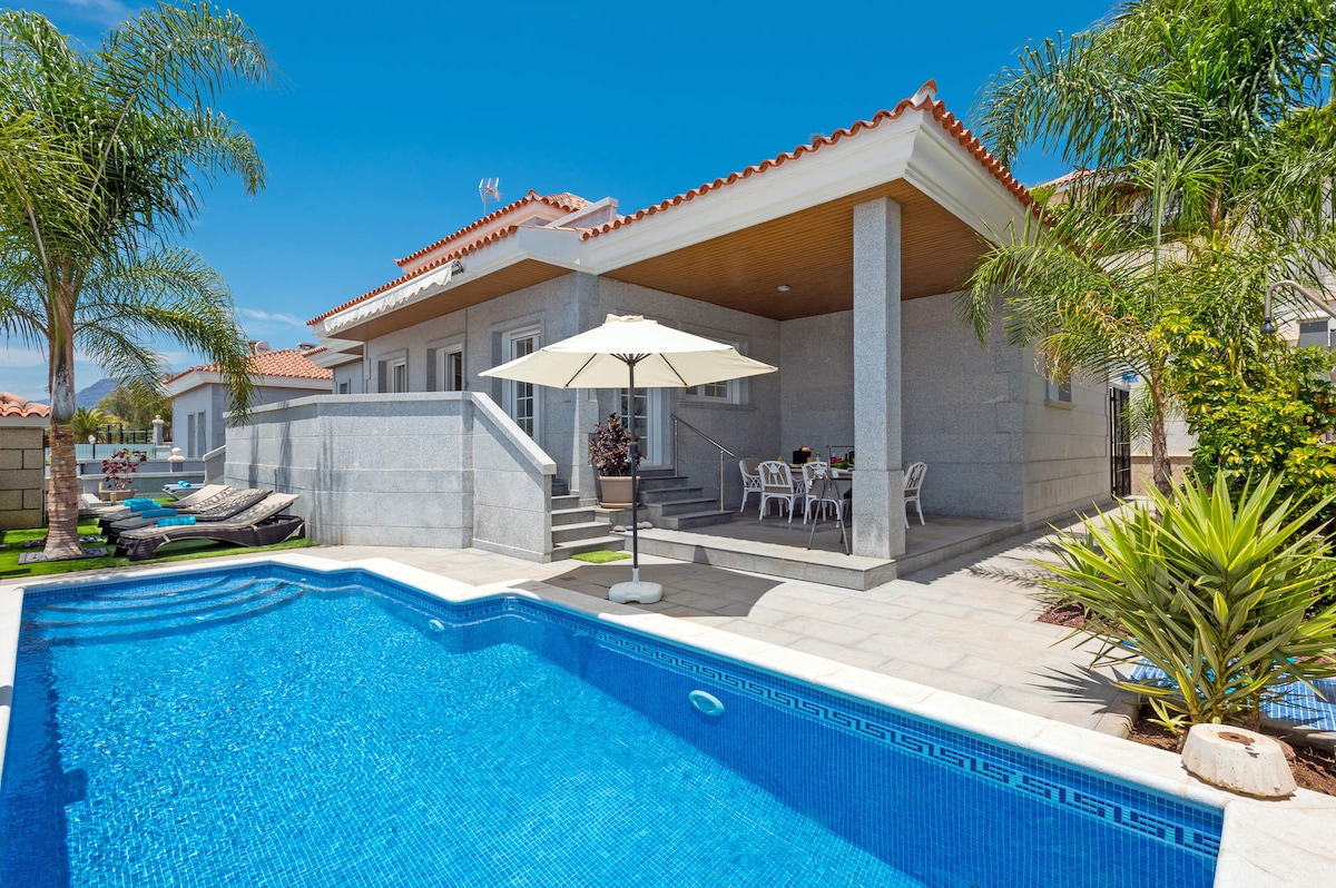 Villa que cuenta con tres habitaciones, dos baños, salón-cocina amplios y un precioso jardín con piscina no climatizada. En el sur de Tenerife hace calor todo el año por lo que la piscina se puede usar siempre, sin necesidad de estar climatizada. En la villa hay wifi y todas las comodidades necesarias para una estupenda estancia. En el salón y en todas las habitaciones excepto en una hay aire acondicionado, la que no tiene aire acondicionado tiene ventilador manual.