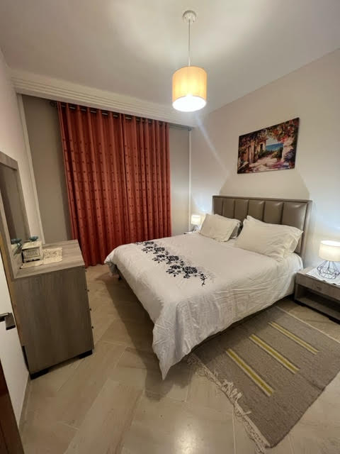 Relax in this quiet and elegant accommodation located in Ain Zaghouan Nord La Marsa. A beautiful, fully furnished apartment. Fully equipped kitchen open to the living room. Living room with 50-inch smart TV and Netflix subscription available. Spacious bedroom with a large queen size bed and large wall-mounted dressing room for more storage. A superb dressing table equipped with a pouf to make yourself look beautiful before heading out for the evening. An outdoor terrace that leaves you amazed